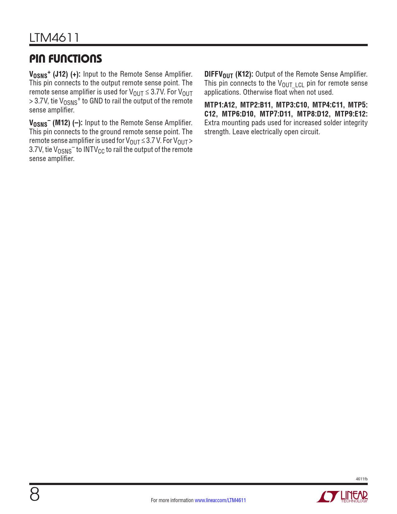 Input to the Remote Sense Amplifier. Extra mounting pads used for increased solder integrity This pin connects to the ground remote sense point. The strength. Leave electrical y open circuit. remote sense amplifier is used for VOUT ≤ 3.7 V. For VOUT > 3.7V, tie V – OSNS to INTVCC to rail the output of the remote sense amplifier. 4611fb 8 For more information www.linear.com/LTM4611 Document Outline Features Applications Description Typical Application Absolute Maximum Ratings Pin Configuration Order Information Electrical Characteristics Typical Performance Characteristics Pin Functions Block Diagram Decoupling Requirements Operation Applications Information Typical Applications Package Photograph Package Description Revision History Typical Application Related Parts