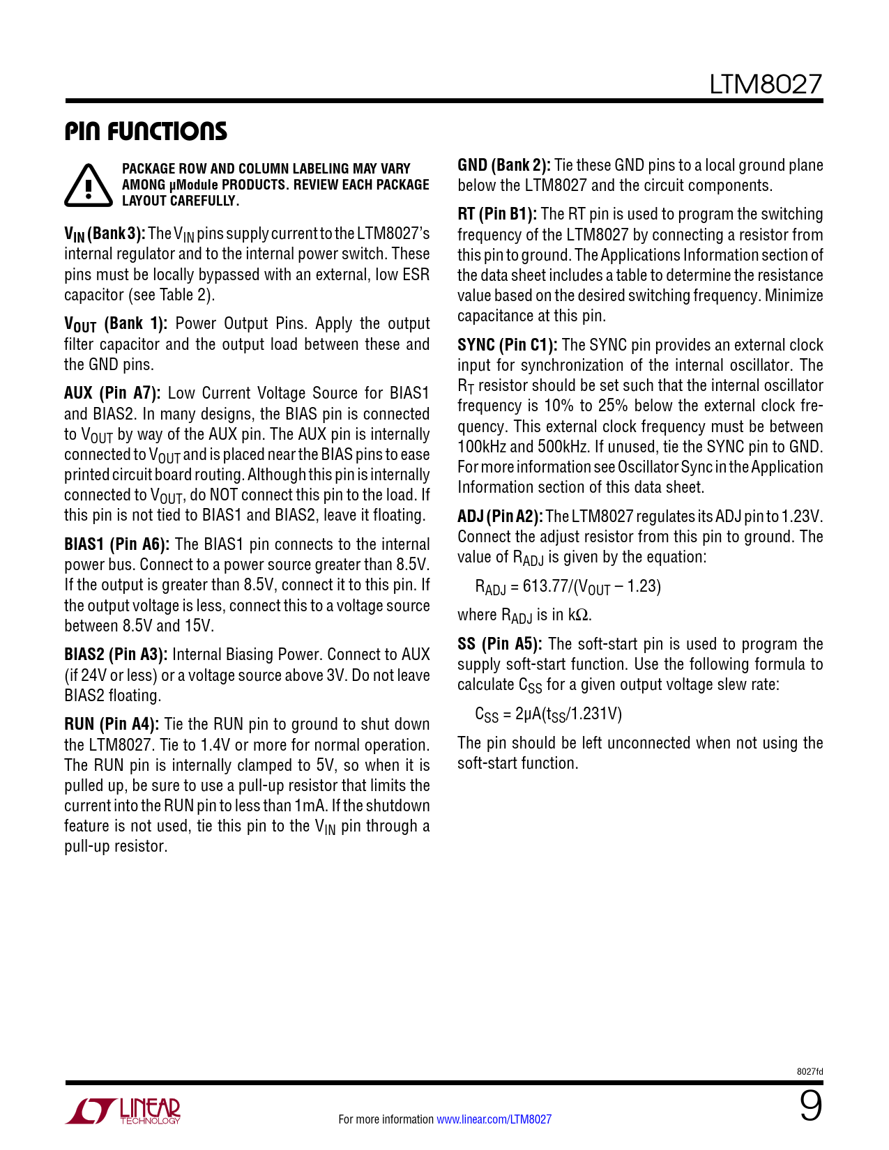 PIN FUNCTIONS. PACKAGE ROW AND COLUMN LABELING MAY VARY. GND (Bank 2):. AMONG µModule PRODUCTS. REVIEW EACH PACKAGE