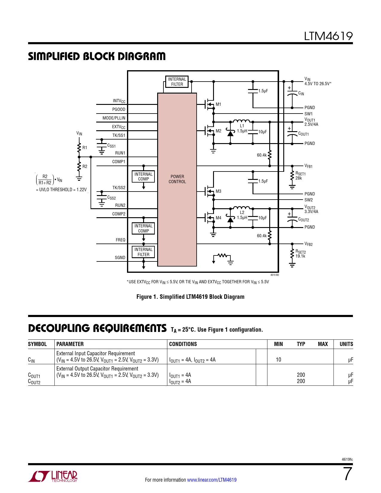 Figure 1. Simplified LTM4619 Block Diagram Decoupling requireMenTs TA = 25°C. Use Figure 1 configuration. SYMBOL PARAMETER CONDITIONS MIN TYP MAX UNITS