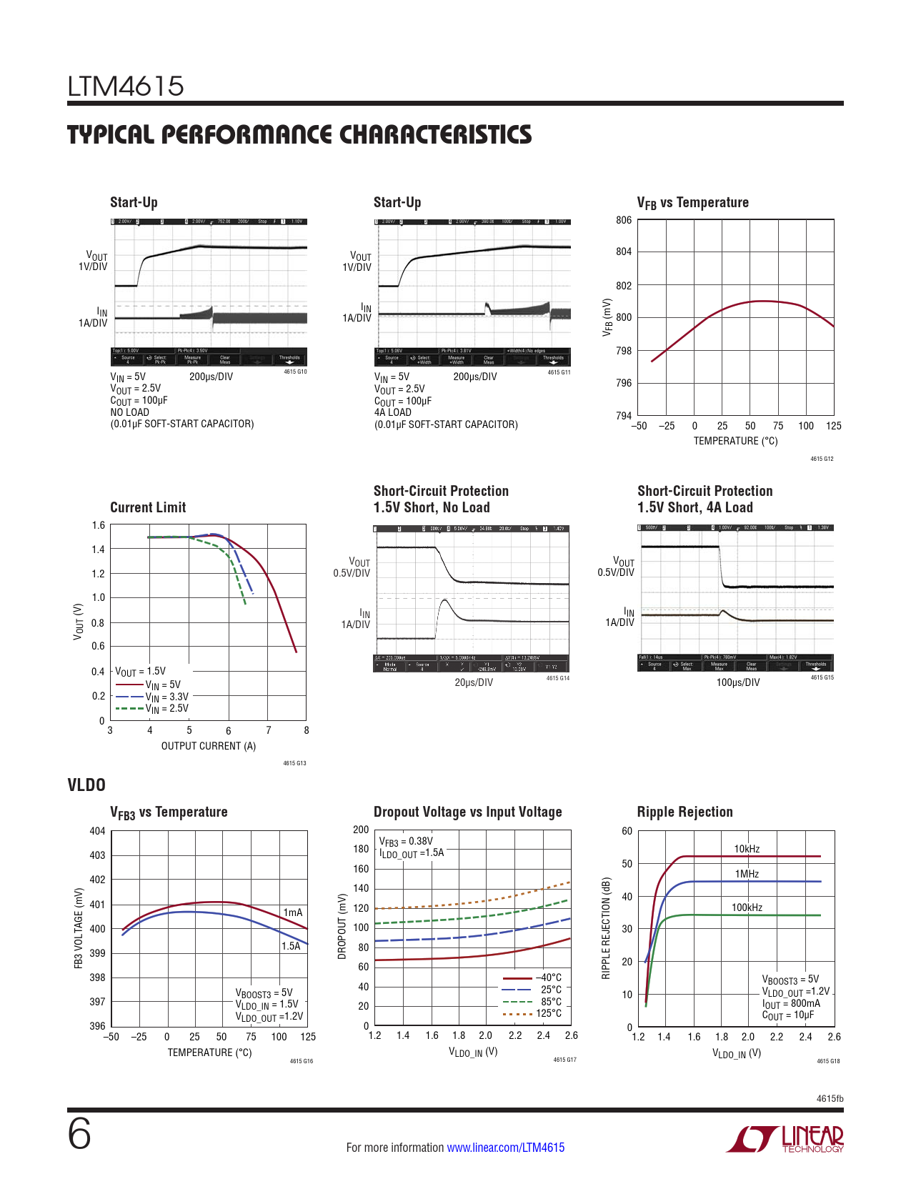 806 V 804 OUT VOUT 1V/DIV 1V/DIV 802 I I IN IN 1A/DIV 1A/DIV (mV) 800 V FB 798 VIN = 5V 200µs/DIV 4615 G10 VIN = 5V 200µs/DIV 4615 G11 V 796 OUT = 2.5V VOUT = 2.5V COUT = 100µF COUT = 100µF NO LOAD 4A LOAD 794 (0.01µF SOFT-START CAPACITOR) (0.01µF SOFT-START CAPACITOR) –50 –25 0 25 50 75 100 125 TEMPERATURE (°C) 4615 G12