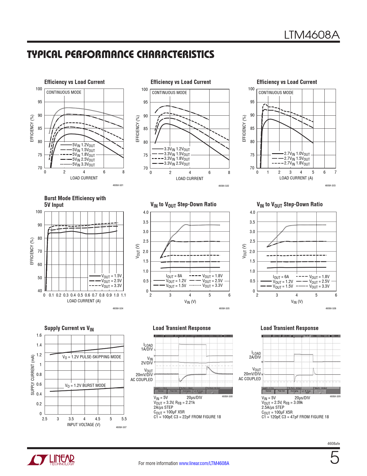 100 4.0 4.0 3.5 3.5 90 3.0 3.0 80 2.5 2.5 (V) (V) 70 2.0 2.0 V OUT V OUT 1.5 1.5 EFFICIENCY (%) 60 1.0 1.0 VOUT = 1.5V IOUT = 8A VOUT = 1.8V 50 IOUT = 6A VOUT = 1.8V VOUT = 2.5V 0.5 VOUT = 1.2V VOUT = 2.5V 0.5 VOUT = 1.2V VOUT = 2.5V VOUT = 3.3V VOUT = 1.5V VOUT = 3.3V VOUT = 1.5V VOUT = 3.3V 40 0 0 0 0.1 0.2 0.3 0.4 0.5 0.6 0.7 0.8 0.9 1.0 1.1 2 3 4 5 6 2 3 4 5 6 LOAD CURRENT (A) VIN (V) VIN (V) 4608A G04 4608A G05 4608A G06
