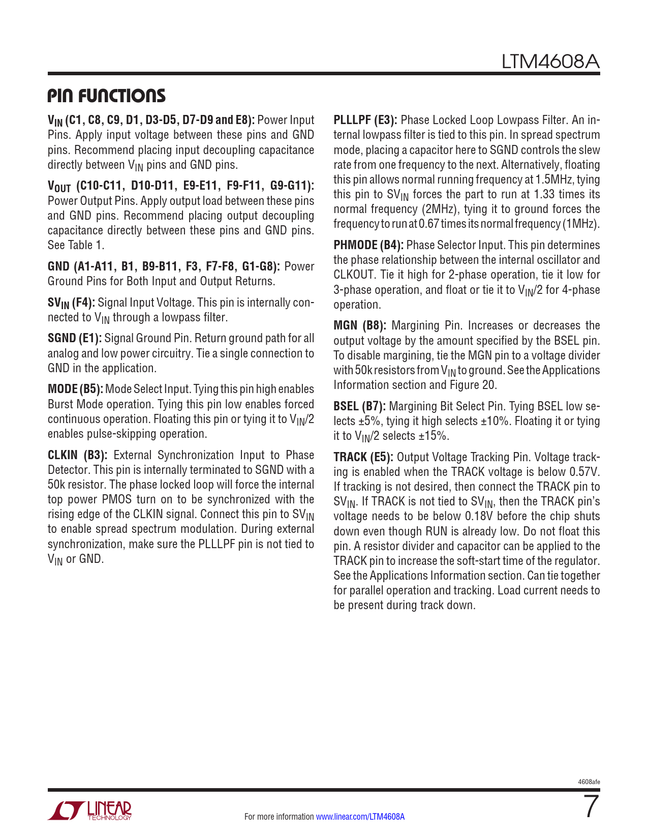 LTM4608A PIN FUNCTIONSVIN (C1, C8, C9, D1, D3-D5, D7-D9 and E8): Power Input PLLLPF (E3): Phase Locked Loop Lowpass Filter. An in- Pins. Apply input voltage between these pins and GND ternal lowpass filter is tied to this pin. In spread spectrum pins. Recommend placing input decoupling capacitance mode, placing a capacitor here to SGND controls the slew directly between VIN pins and GND pins. rate from one frequency to the next. Alternatively, floating this pin allows normal running frequency at 1.5MHz, tying VOUT (C10-C11, D10-D11, E9-E11, F9-F11, G9-G11): this pin to SVIN forces the part to run at 1.33 times its Power Output Pins. Apply output load between these pins normal frequency (2MHz), tying it to ground forces the and GND pins. Recommend placing output decoupling frequency to run at 0.67 times its normal frequency (1MHz). capacitance directly between these pins and GND pins. See Table 1. PHMODE (B4): Phase Selector Input. This pin determines the phase relationship between the internal oscillator and GND (A1-A11, B1, B9-B11, F3, F7-F8, G1-G8): Power CLKOUT. Tie it high for 2-phase operation, tie it low for Ground Pins for Both Input and Output Returns. 3-phase operation, and float or tie it to VIN/2 for 4-phase SVIN (F4): Signal Input Voltage. This pin is internally con- operation. nected to VIN through a lowpass filter. MGN (B8): Margining Pin. Increases or decreases the SGND (E1): Signal Ground Pin. Return ground path for all output voltage by the amount specified by the BSEL pin. analog and low power circuitry. Tie a single connection to To disable margining, tie the MGN pin to a voltage divider GND in the application. with 50k resistors from VIN to ground. See the Applications Information section and Figure 20. MODE (B5): Mode Select Input. Tying this pin high enables Burst Mode operation. Tying this pin low enables forced BSEL (B7): Margining Bit Select Pin. Tying BSEL low se- continuous operation. Floating this pin or tying it to VIN/2 lects ±5%, tying it high selects ±10%. Floating it or tying enables pulse-skipping operation. it to VIN/2 selects ±15%. CLKIN (B3): External Synchronization Input to Phase TRACK (E5): Output Voltage Tracking Pin. Voltage track- Detector. This pin is internally terminated to SGND with a ing is enabled when the TRACK voltage is below 0.57V. 50k resistor. The phase locked loop will force the internal If tracking is not desired, then connect the TRACK pin to top power PMOS turn on to be synchronized with the SVIN. If TRACK is not tied to SVIN, then the TRACK pin’s rising edge of the CLKIN signal. Connect this pin to SVIN voltage needs to be below 0.18V before the chip shuts to enable spread spectrum modulation. During external down even though RUN is already low. Do not float this synchronization, make sure the PLLLPF pin is not tied to pin. A resistor divider and capacitor can be applied to the VIN or GND. TRACK pin to increase the soft-start time of the regulator. See the Applications Information section. Can tie together for parallel operation and tracking. Load current needs to be present during track down. 4608afe For more information www.linear.com/LTM4608A 7 Document Outline Features Applications Description Typical Application Absolute Maximum Ratings Order Information Typical Performance Characteristics Pin Functions Simplified Block Diagram Operation Applications Information Typical Applications Package Description Package Photo Revision History Package Description Related Parts