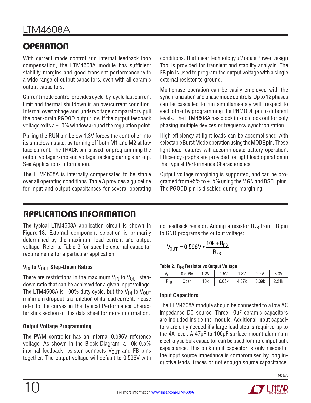LTM4608A OPERATION With current mode control and internal feedback loop conditions. The Linear Technology µModule Power Design compensation, the LTM4608A module has sufficient Tool is provided for transient and stability analysis. The stability margins and good transient performance with FB pin is used to program the output voltage with a single a wide range of output capacitors, even with all ceramic external resistor to ground. output capacitors. Multiphase operation can be easily employed with the Current mode control provides cycle-by-cycle fast current synchronization and phase mode controls. Up to 12 phases limit and thermal shutdown in an overcurrent condition. can be cascaded to run simultaneously with respect to Internal overvoltage and undervoltage comparators pull each other by programming the PHMODE pin to different the open-drain PGOOD output low if the output feedback levels. The LTM4608A has clock in and clock out for poly voltage exits a ±10% window around the regulation point. phasing multiple devices or frequency synchronization. Pulling the RUN pin below 1.3V forces the controller into High efficiency at light loads can be accomplished with its shutdown state, by turning off both M1 and M2 at low selectable Burst Mode operation using the MODE pin. These load current. The TRACK pin is used for programming the light load features will accommodate battery operation. output voltage ramp and voltage tracking during start-up. Efficiency graphs are provided for light load operation in See Applications Information. the Typical Performance Characteristics. The LTM4608A is internally compensated to be stable Output voltage margining is supported, and can be pro- over all operating conditions. Table 3 provides a guideline gramed from ±5% to ±15% using the MGN and BSEL pins. for input and output capacitances for several operating The PGOOD pin is disabled during margining APPLICATIONS INFORMATION The typical LTM4608A application circuit is shown in no feedback resistor. Adding a resistor RFB from FB pin Figure 18. External component selection is primarily to GND programs the output voltage: determined by the maximum load current and output voltage. Refer to Table 3 for specific external capacitor VOUT = 0.596V • 10k +RFB requirements for a particular application. RFB VIN to VOUT Step-Down RatiosTable 2. RFB Resistor vs Output Voltage There are restrictions in the maximum V VOUT 0.596V 1.2V 1.5V 1.8V 2.5V 3.3V IN to VOUT step- down ratio that can be achieved for a given input voltage. RFB Open 10k 6.65k 4.87k 3.09k 2.21k The LTM4608A is 100% duty cycle, but the VIN to VOUT minimum dropout is a function of its load current. Please Input Capacitors refer to the curves in the Typical Performance Charac- The LTM4608A module should be connected to a low AC teristics section of this data sheet for more information. impedance DC source. Three 10µF ceramic capacitors are included inside the module. Additional input capaci- Output Voltage Programming tors are only needed if a large load step is required up to The PWM controller has an internal 0.596V reference the 4A level. A 47µF to 100µF surface mount aluminum voltage. As shown in the Block Diagram, a 10k 0.5% electrolytic bulk capacitor can be used for more input bulk internal feedback resistor connects V capacitance. This bulk input capacitor is only needed if OUT and FB pins together. The output voltage will default to 0.596V with the input source impedance is compromised by long in- ductive leads, traces or not enough source capacitance. 4608afe 10 For more information www.linear.com/LTM4608A Document Outline Features Applications Description Typical Application Absolute Maximum Ratings Order Information Typical Performance Characteristics Pin Functions Simplified Block Diagram Operation Applications Information Typical Applications Package Description Package Photo Revision History Package Description Related Parts
