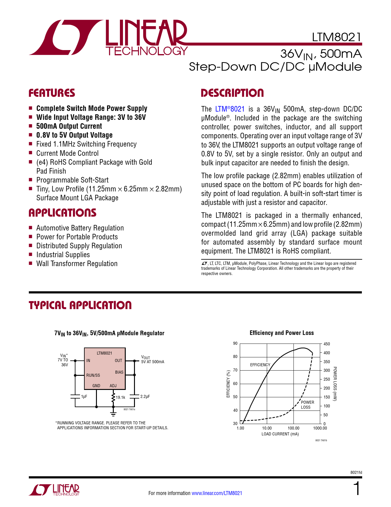 The LTM8021 is packaged in a thermally enhanced, n compact (11.25mm × 6.25mm) and low profile (2.82mm) Automotive Battery Regulation n overmolded land grid array (LGA) package suitable Power for Portable Products n for automated assembly by standard surface mount Distributed Supply Regulation n equipment. The LTM8021 is RoHS compliant. Industrial Supplies n Wall Transformer Regulation L, LT, LTC, LTM, µModule, PolyPhase, Linear Technology and the Linear logo are registered trademarks of Linear Technology Corporation. All other trademarks are the property of their respective owners.