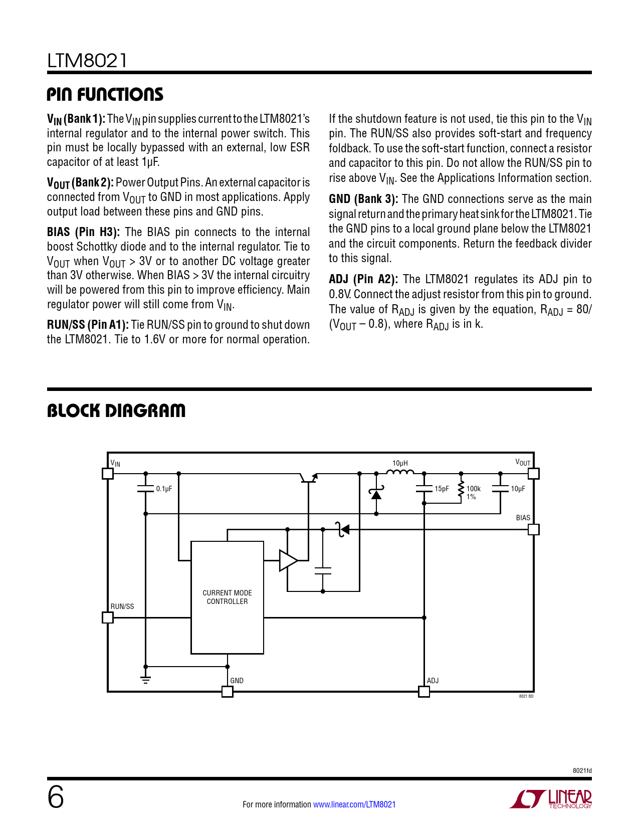 pin FuncTions. VIN (Bank 1):. OUT (Bank 2):. GND (Bank 3):. BIAS (Pin H3):. ADJ (Pin A2):. RUN/SS (Pin A1):. block DiagraM