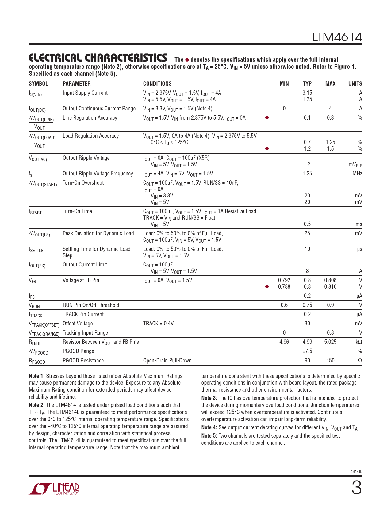 The LTM4614 is tested under pulsed load conditions such that the device during momentary overload conditions. Junction temperatures TJ ≈ TA. The LTM4614E is guaranteed to meet performance specifications will exceed 125°C when overtemperature is activated. Continuous over the 0°C to 125°C internal operating temperature range. Specifications overtemperature activation can impair long-term reliability. over the –40°C to 125°C internal operating temperature range are assured