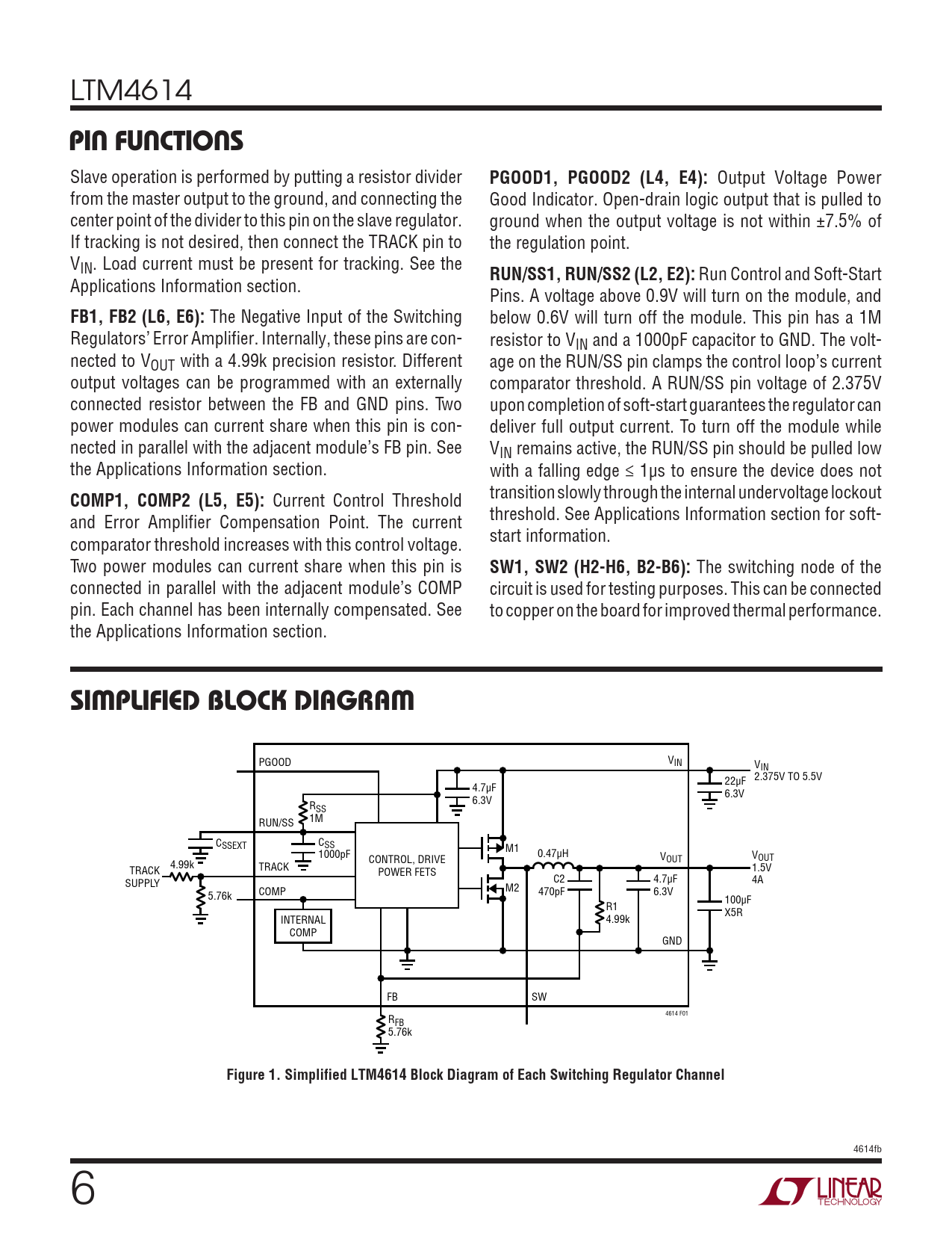 PGOOD VIN VIN 2.375V TO 5.5V 4.7µF 22µF 6.3V 6.3V RSS 1M RUN/SS C C SSEXT SS 1000pF M1 0.47µH V V CONTROL, DRIVE OUT OUT TRACK 4.99k TRACK 1.5V POWER FETS SUPPLY C2 4.7µF 4A M2 5.76k COMP 470pF 6.3V 100µF R1 X5R INTERNAL 4.99k COMP GND FB SW R 4614 F01 FB 5.76k