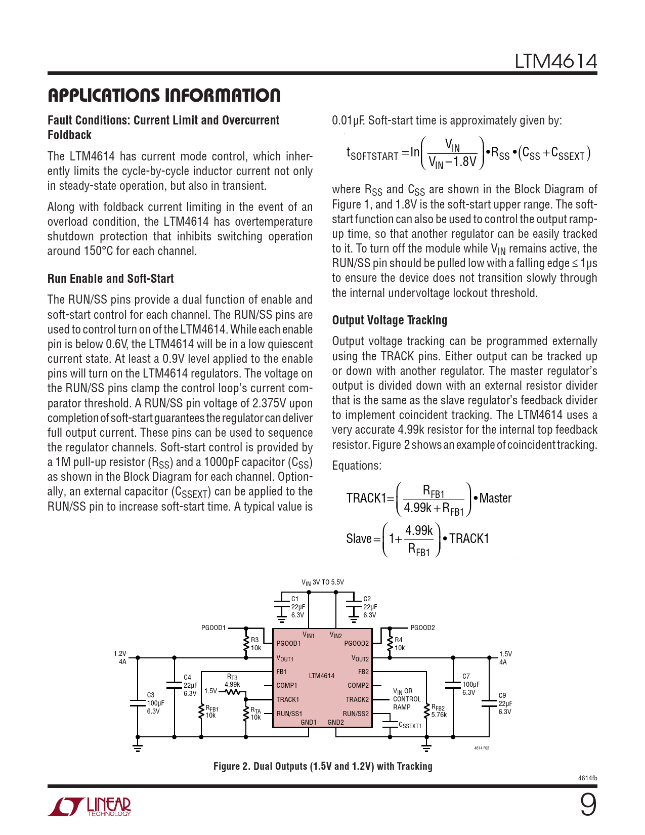  V  The LTM4614 has current mode control, which inher- t IN SOFTSTART = In ( )  V  •RSS • CSS +CSSEXT ently limits the cycle-by-cycle inductor current not only IN – 1.8V in steady-state operation, but also in transient. where RSS and CSS are shown in the Block Diagram of Along with foldback current limiting in the event of an Figure 1, and 1.8V is the soft-start upper range. The soft- overload condition, the LTM4614 has overtemperature start function can also be used to control the output ramp- shutdown protection that inhibits switching operation up time, so that another regulator can be easily tracked around 150°C for each channel. to it. To turn off the module while VIN remains active, the RUN/SS pin should be pulled low with a falling edge ≤ 1µs