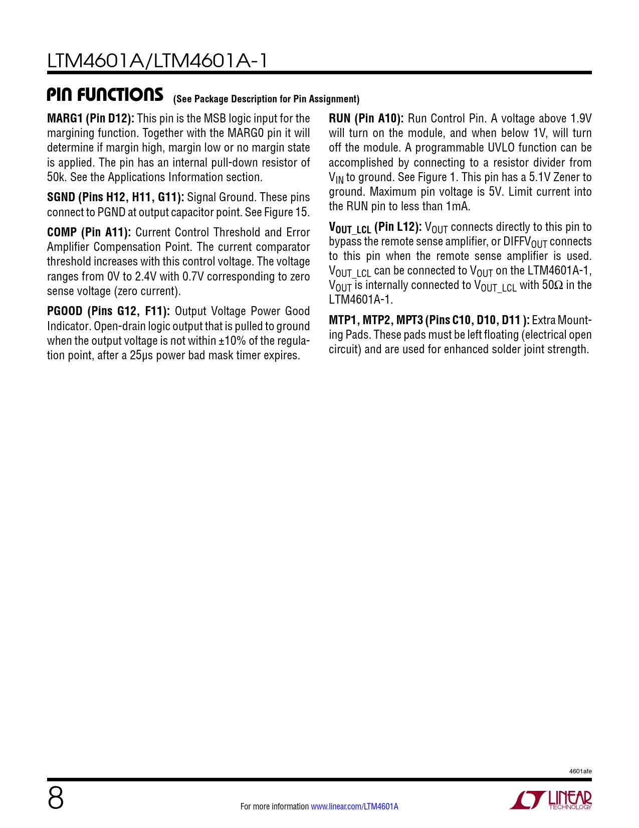 PIN FUNCTIONS (See Package Description for Pin Assignment). MARG1 (Pin D12):. RUN (Pin A10):. SGND (Pins H12, H11, G11):