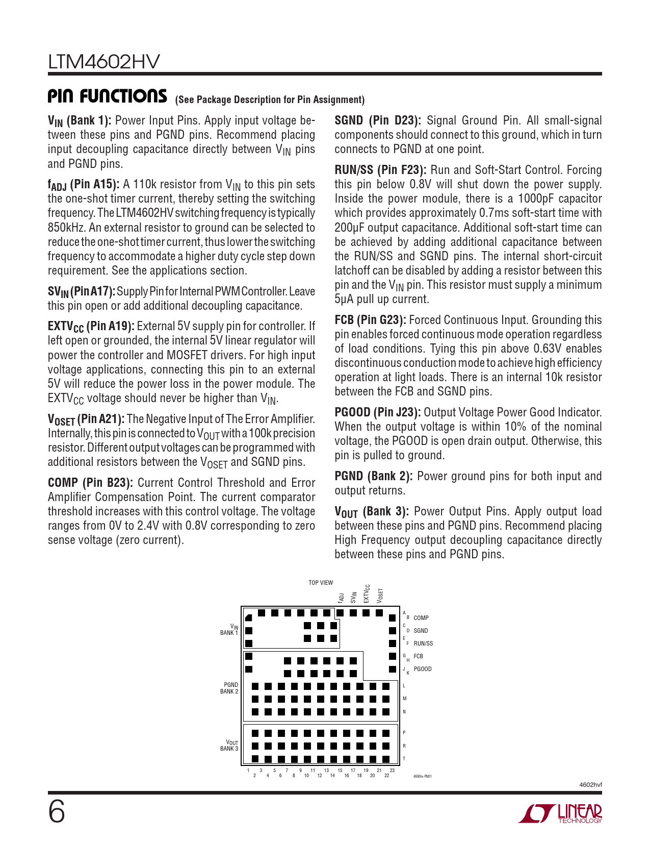 Power Output Pins. Apply output load ranges from 0V to 2.4V with 0.8V corresponding to zero between these pins and PGND pins. Recommend placing sense voltage (zero current). High Frequency output decoupling capacitance directly between these pins and PGND pins. TOP VIEW CC IN OSET f ADJ SV EXTV V 2 3 4 5 6 7 16 17 18 19 A 1 20 B COMP 9 10 11 C VIN 8 21 BANK 1 D SGND 13 14 15 E 12 22 F RUN/SS 25 23 26 27 28 29 30 31 G FCB H 32 24 33 34 35 36 37 38 J PGOOD K PGND 39 40 41 42 43 44 45 46 47 48 49 L BANK 2 50 51 52 53 54 55 56 57 58 59 60 M 61 62 63 64 65 66 67 68 69 70 71 N 72 73 74 75 76 77 78 79 80 81 82 P VOUT 83 84 85 86 87 88 89 90 91 92 93 R BANK 3 94 95 96 97 98 99 100 101 102 103 104 T 1 3 5 7 9 11 13 15 17 19 21 23 2 4 6 8 10 12 14 16 18 20 22 4600hv PN01 4602hvf 6