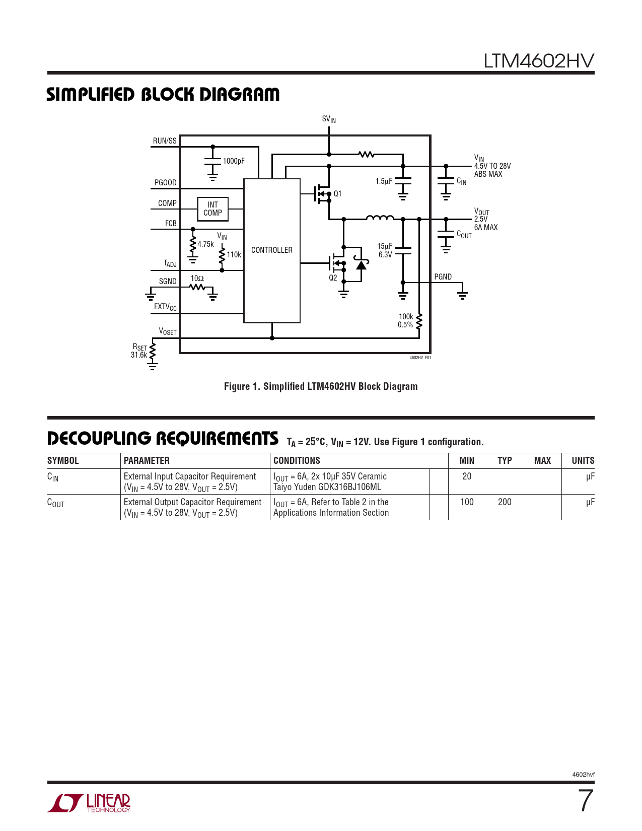 Figure 1. Simplifi ed LTM4602HV Block Diagram U W U DECOUPLI G REQUIRE E TS TA = 25°C, VIN = 12V. Use Figure 1 confi guration. SYMBOL PARAMETER CONDITIONS MIN TYP MAX UNITS