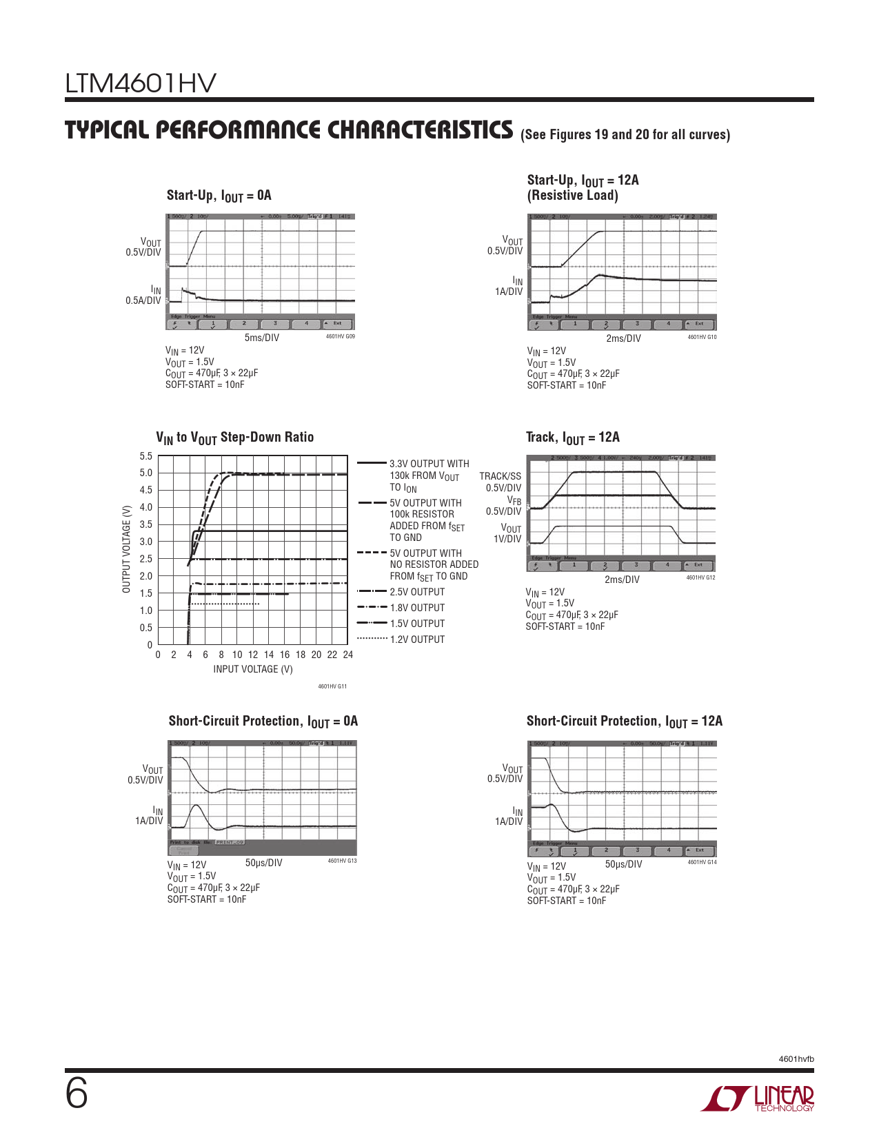 VOUT VOUT 0.5V/DIV 0.5V/DIV IIN IIN 1A/DIV 1A/DIV V 50µs/DIV 4601HV G13 IN = 12V V 50µs/DIV 4601HV G14 IN = 12V VOUT = 1.5V VOUT = 1.5V COUT = 470µF, 3 × 22µF COUT = 470µF, 3 × 22µF SOFT-START = 10nF SOFT-START = 10nF 4601hvfb 6 Document Outline Features Applications Description Typical Application Absolute Maximum Ratings Pin Configuration Order Information Electrical Characteristics Typical Performance Characteristics Pin Functions Simplified Block Diagram Decoupling Requirements Operation Applications Information Typical Applications Package Description Revision History Package Photos Related Parts