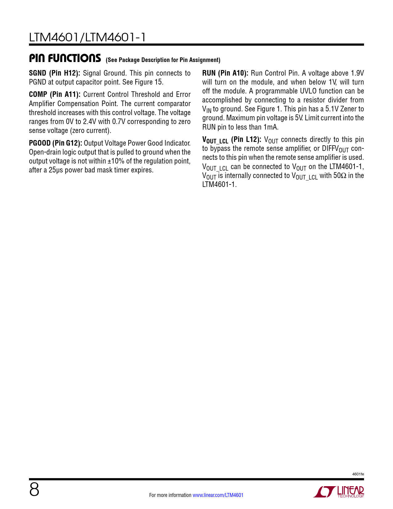 LTM4601/LTM4601-1 pin FuncTions (See Package Description for Pin Assignment) SGND (Pin H12): Signal Ground. This pin connects to RUN (Pin A10): Run Control Pin. A voltage above 1.9V PGND at output capacitor point. See Figure 15. will turn on the module, and when below 1V, will turn COMP (Pin A11): Current Control Threshold and Error off the module. A programmable UVLO function can be Amplifier Compensation Point. The current comparator accomplished by connecting to a resistor divider from threshold increases with this control voltage. The voltage VIN to ground. See Figure 1. This pin has a 5.1V Zener to ranges from 0V to 2.4V with 0.7V corresponding to zero ground. Maximum pin voltage is 5V. Limit current into the sense voltage (zero current). RUN pin to less than 1mA. PGOOD (Pin G12): Output Voltage Power Good Indicator. VOUT_LCL (Pin L12): VOUT connects directly to this pin Open-drain logic output that is pulled to ground when the to bypass the remote sense amplifier, or DIFFVOUT con- output voltage is not within ±10% of the regulation point, nects to this pin when the remote sense amplifier is used. after a 25µs power bad mask timer expires. VOUT_LCL can be connected to VOUT on the LTM4601-1, VOUT is internally connected to VOUT_LCL with 50W in the LTM4601-1. 4601fe 8 For more information www.linear.com/LTM4601 Document Outline Features Applications Description Typical Application Absolute Maximum Ratings Pin Configuration Electrical Characteristics Typical Performance Characteristics Pin Functions Simplified Block Diagram Decoupling Requirements Operation Applications Information Typical Applications Package Description Revision History Package Photo Related Parts