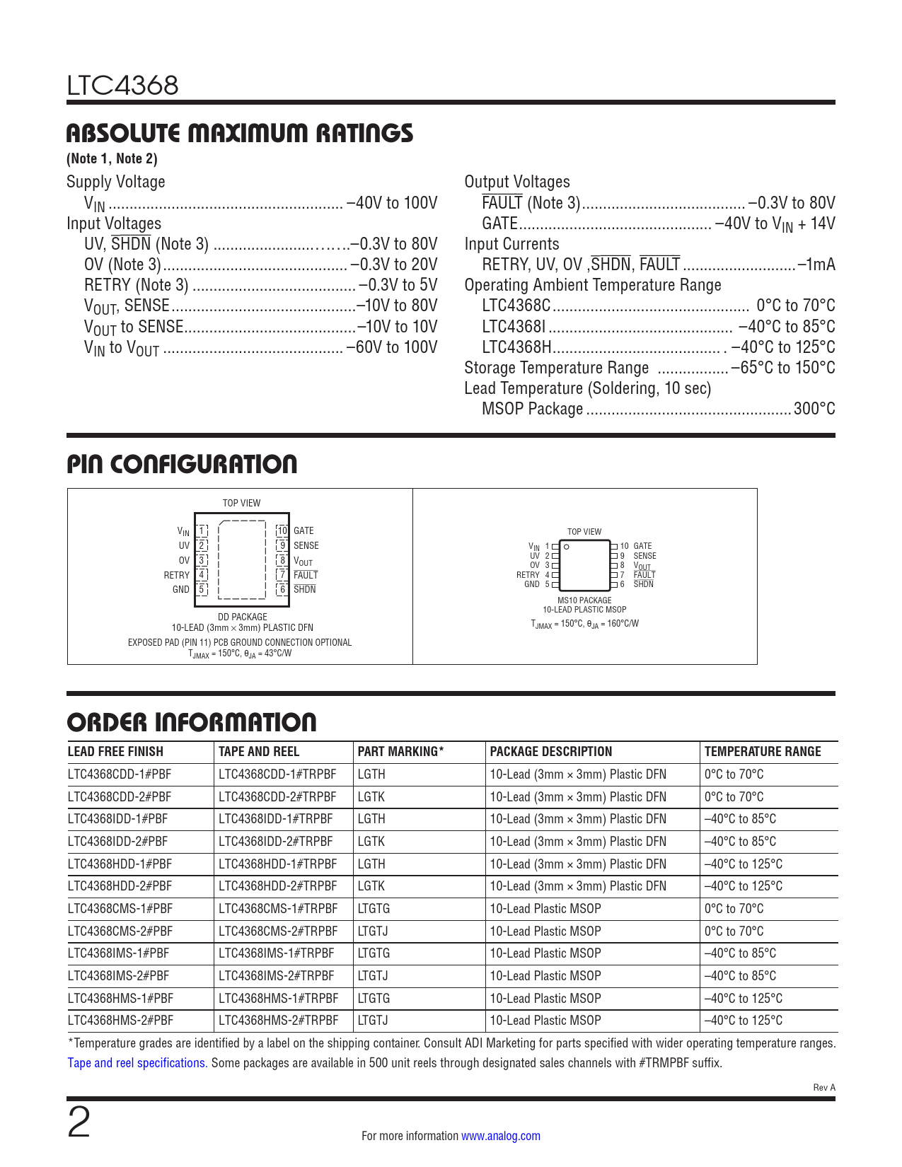 LTC4368CDD-1#PBF LTC4368CDD-1#TRPBF LGTH 10-Lead (3mm × 3mm) Plastic DFN 0°C to 70°C LTC4368CDD-2#PBF LTC4368CDD-2#TRPBF LGTK 10-Lead (3mm × 3mm) Plastic DFN 0°C to 70°C LTC4368IDD-1#PBF LTC4368IDD-1#TRPBF LGTH 10-Lead (3mm × 3mm) Plastic DFN –40°C to 85°C LTC4368IDD-2#PBF LTC4368IDD-2#TRPBF LGTK 10-Lead (3mm × 3mm) Plastic DFN –40°C to 85°C LTC4368HDD-1#PBF LTC4368HDD-1#TRPBF LGTH 10-Lead (3mm × 3mm) Plastic DFN –40°C to 125°C LTC4368HDD-2#PBF LTC4368HDD-2#TRPBF LGTK 10-Lead (3mm × 3mm) Plastic DFN –40°C to 125°C LTC4368CMS-1#PBF LTC4368CMS-1#TRPBF LTGTG 10-Lead Plastic MSOP 0°C to 70°C LTC4368CMS-2#PBF LTC4368CMS-2#TRPBF LTGTJ 10-Lead Plastic MSOP 0°C to 70°C LTC4368IMS-1#PBF LTC4368IMS-1#TRPBF LTGTG 10-Lead Plastic MSOP –40°C to 85°C LTC4368IMS-2#PBF LTC4368IMS-2#TRPBF LTGTJ 10-Lead Plastic MSOP –40°C to 85°C LTC4368HMS-1#PBF LTC4368HMS-1#TRPBF LTGTG 10-Lead Plastic MSOP –40°C to 125°C LTC4368HMS-2#PBF LTC4368HMS-2#TRPBF LTGTJ 10-Lead Plastic MSOP –40°C to 125°C *Temperature grades are identified by a label on the shipping container. Consult ADI Marketing for parts specified with wider operating temperature ranges. Tape and reel specifications. Some packages are available in 500 unit reels through designated sales channels with #TRMPBF suffix. Rev A 2 For more information www.analog.com Document Outline Features Applications Description Typical Application Absolute Maximum Ratings Pin Configuration Order Information Pin Functions Block Diagram Applications Information Related Parts Features Applications Typical Application Description Absolute Maximum Ratings Pin Configuration Order Information Electrical Characteristics Pin Functions Block Diagram Operation Applications Information Package Description Revision History Typical Application Related Parts