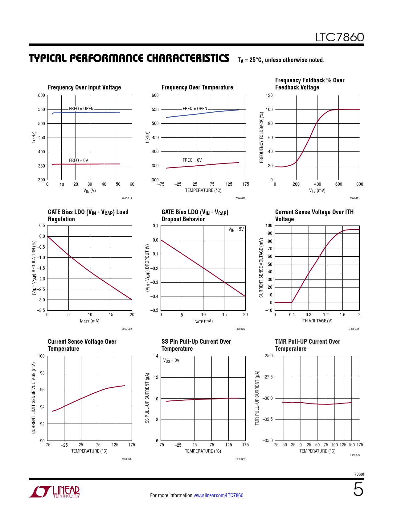 600 600 120 550 FREQ = OPEN 550 FREQ = OPEN 100 500 500 80 450 450 60 f (kHz) f (kHz) 400 400 40 FREQ = 0V FREQ = 0V FREQUENCY FOLDBACK (%) 350 350 20 300 300 0 0 10 20 30 40 50 60 –75 –25 25 75 125 175 0 200 400 600 800 VIN (V) TEMPERATURE (°C) VFB (mV) 7860 G19 7860 G20 7860 G21