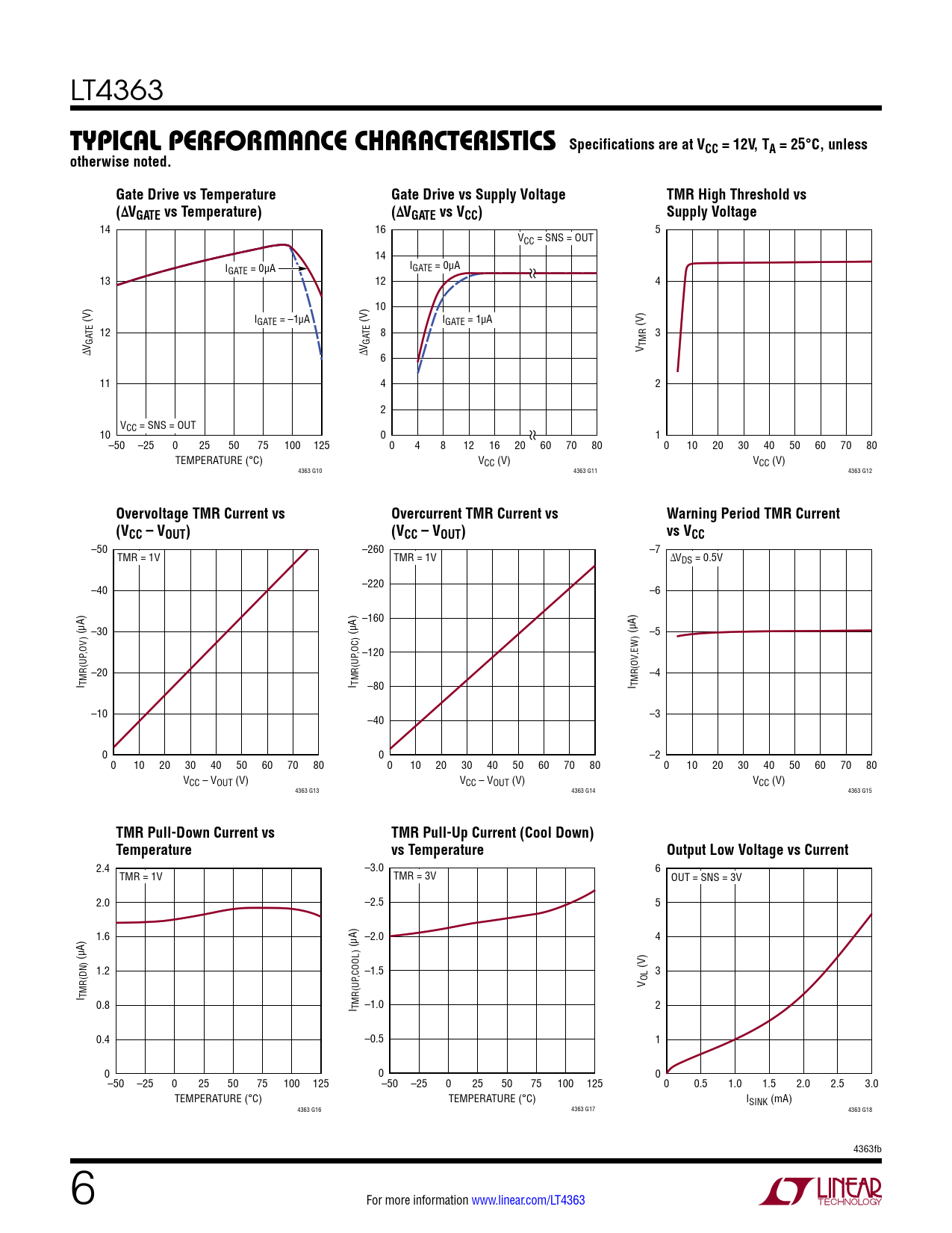 14 16 5 VCC = SNS = OUT 14 I I GATE = 0µA GATE = 0µA 13 12 4 10 (V) IGATE = –1µA (V) IGATE = 1µA (V) TE 12 TE 8 3 GA GA ∆V ∆V V TMR 6 11 4 2 2 VCC = SNS = OUT 10 0 1 –50 –25 0 25 50 75 100 125 0 4 8 12 16 20 60 70 80 0 10 20 30 40 50 60 70 80 TEMPERATURE (°C) VCC (V) VCC (V) 4363 G10 4363 G11 4363 G12