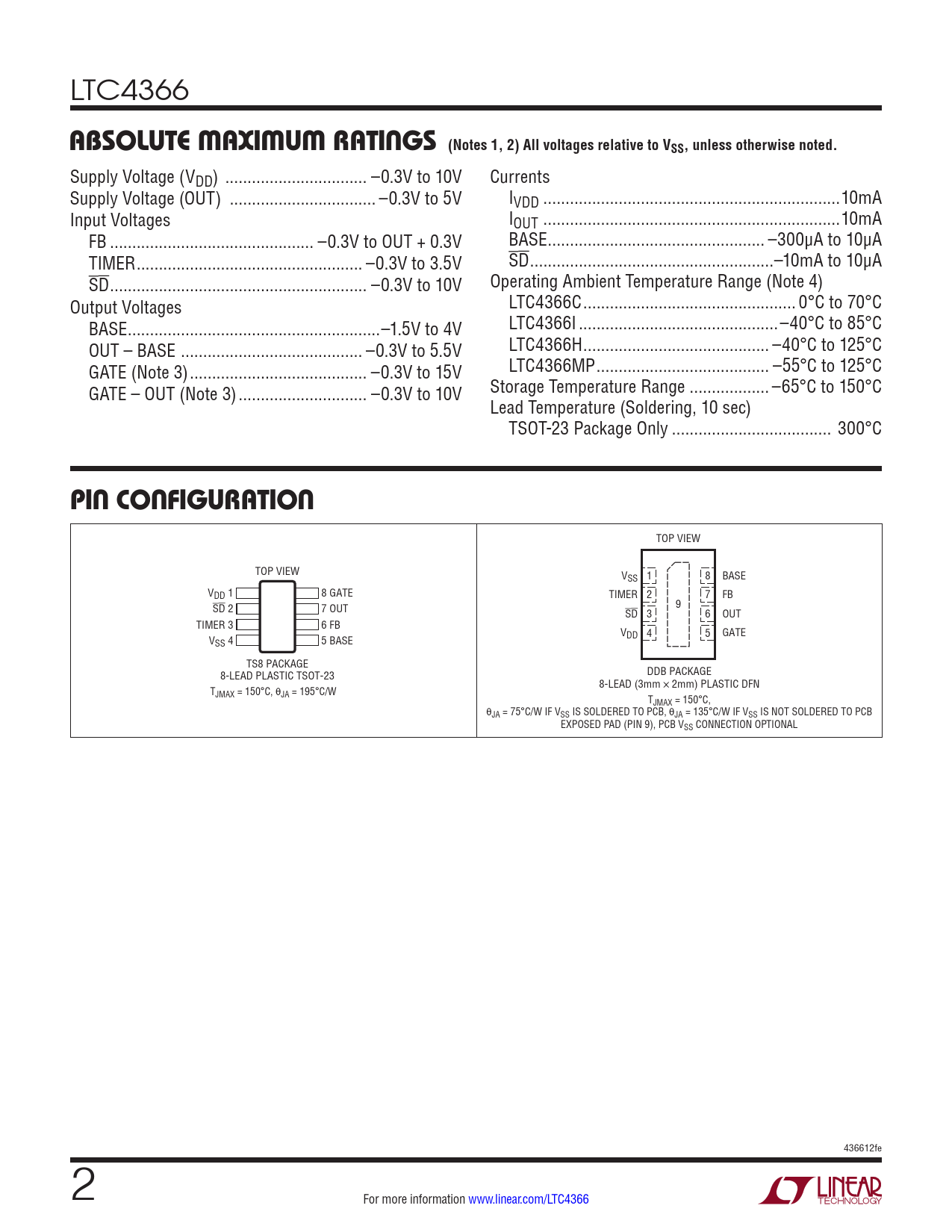 LTC4366 ABSOLUTE MAXIMUM RATINGS (Notes 1, 2) All voltages relative to VSS, unless otherwise noted. Supply Voltage (VDD) .. –0.3V to 10V Currents Supply Voltage (OUT) ... –0.3V to 5V IVDD ...10mA Input Voltages IOUT ...10mA FB .. –0.3V to OUT + 0.3V BASE ... –300µA to 10µA TIMER ... –0.3V to 3.5V SD ...–10mA to 10µA SD .. –0.3V to 10V Operating Ambient Temperature Range (Note 4) Output Voltages LTC4366C .. 0°C to 70°C BASE ...–1.5V to 4V LTC4366I ...–40°C to 85°C OUT – BASE ... –0.3V to 5.5V LTC4366H .. –40°C to 125°C GATE (Note 3) .. –0.3V to 15V LTC4366MP ... –55°C to 125°C GATE – OUT (Note 3) ... –0.3V to 10V Storage Temperature Range .. –65°C to 150°C Lead Temperature (Soldering, 10 sec) TSOT-23 Package Only .. 300°C PIN CONFIGURATION TOP VIEW TOP VIEW VSS 1 8 BASE VDD 1 8 GATE TIMER 2 7 FB SD 2 7 OUT 9 SD 3 6 OUT TIMER 3 6 FB VDD 4 5 GATE VSS 4 5 BASE TS8 PACKAGE 8-LEAD PLASTIC TSOT-23 DDB PACKAGE 8-LEAD (3mm × 2mm) PLASTIC DFN T JMAX = 150°C, θJA = 195°C/W TJMAX = 150°C, θJA = 75°C/W IF VSS IS SOLDERED TO PCB, θJA = 135°C/W IF VSS IS NOT SOLDERED TO PCB EXPOSED PAD (PIN 9), PCB VSS CONNECTION OPTIONAL 436612fe 2 For more information www.linear.com/LTC4366 Document Outline Features Applications Description Typical Application Absolute Maximum Ratings Pin Configuration Order Information Electrical Characteristics Pin Functions Simplified Diagram Functional Diagram Operation Applications Information Package Description Typical Application Related Parts