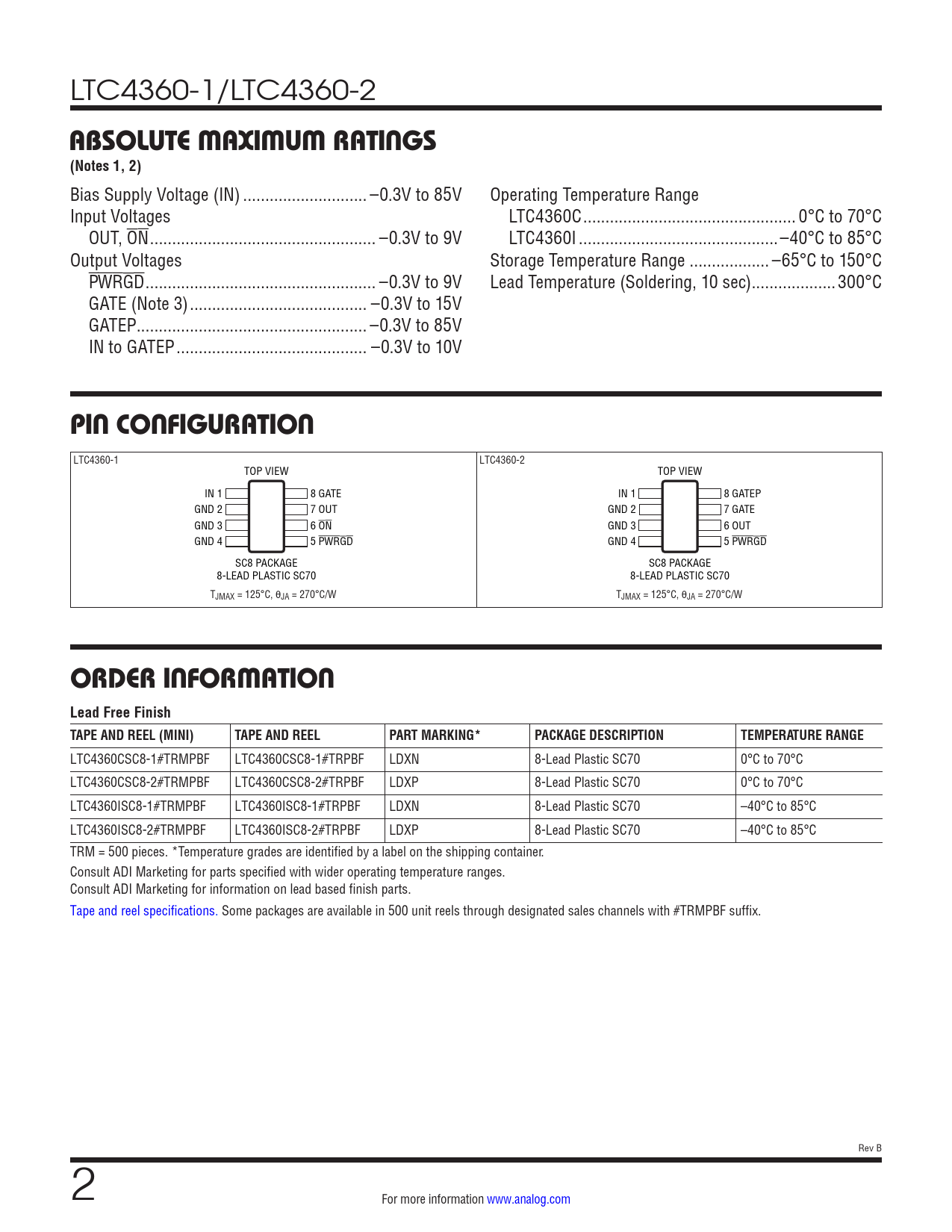 LTC4360CSC8-1#TRMPBF LTC4360CSC8-1#TRPBF LDXN 8-Lead Plastic SC70 0°C to 70°C LTC4360CSC8-2#TRMPBF LTC4360CSC8-2#TRPBF LDXP 8-Lead Plastic SC70 0°C to 70°C LTC4360ISC8-1#TRMPBF LTC4360ISC8-1#TRPBF LDXN 8-Lead Plastic SC70 –40°C to 85°C LTC4360ISC8-2#TRMPBF LTC4360ISC8-2#TRPBF LDXP 8-Lead Plastic SC70 –40°C to 85°C TRM = 500 pieces. *Temperature grades are identified by a label on the shipping container. Consult ADI Marketing for parts specified with wider operating temperature ranges. Consult ADI Marketing for information on lead based finish parts. Tape and reel specifications. Some packages are available in 500 unit reels through designated sales channels with #TRMPBF suffix. Rev B 2 For more information www.analog.com Document Outline Features Applications Typical Application Description Absolute Maximum Ratings Pin Configuration Order Information Electrical Characteristics Typical Performance Characteristics Pin Functions Block Diagram Operation Applications Information Package Description Revision History Typical Application Related Parts