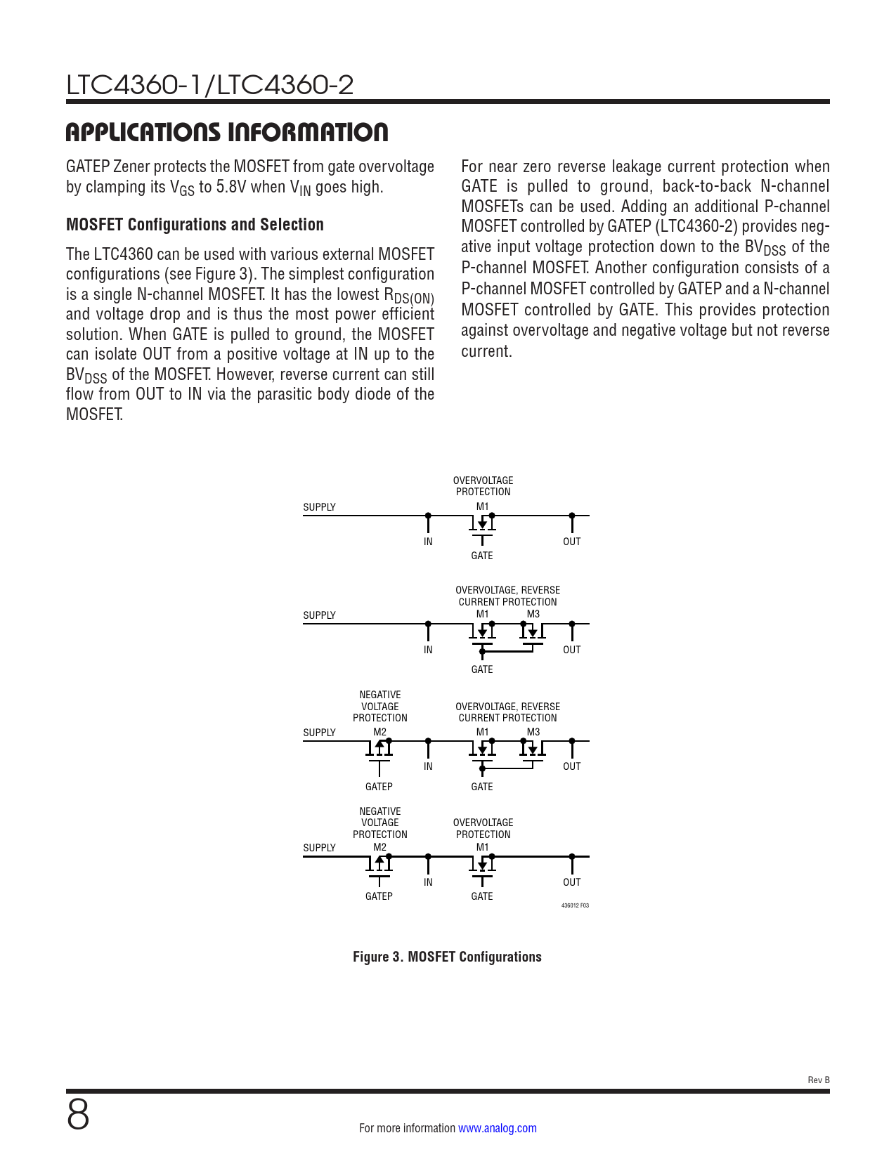 link to page 8 LTC4360-1/LTC4360-2 APPLICATIONS INFORMATION GATEP Zener protects the MOSFET from gate overvoltage For near zero reverse leakage current protection when by clamping its VGS to 5.8V when VIN goes high. GATE is pulled to ground, back-to-back N-channel MOSFETs can be used. Adding an additional P-channel MOSFET Configurations and Selection MOSFET controlled by GATEP (LTC4360-2) provides neg- The LTC4360 can be used with various external MOSFET ative input voltage protection down to the BVDSS of the configurations (see Figure 3). The simplest configuration P-channel MOSFET. Another configuration consists of a is a single N-channel MOSFET. It has the lowest R P-channel MOSFET controlled by GATEP and a N-channel DS(ON) and voltage drop and is thus the most power efficient MOSFET control ed by GATE. This provides protection solution. When GATE is pulled to ground, the MOSFET against overvoltage and negative voltage but not reverse can isolate OUT from a positive voltage at IN up to the current. BVDSS of the MOSFET. However, reverse current can still flow from OUT to IN via the parasitic body diode of the MOSFET. OVERVOLTAGE PROTECTION SUPPLY M1 IN OUT GATE OVERVOLTAGE, REVERSE CURRENT PROTECTION SUPPLY M1 M3 IN OUT GATE NEGATIVE VOLTAGE OVERVOLTAGE, REVERSE PROTECTION CURRENT PROTECTION SUPPLY M2 M1 M3 IN OUT GATEP GATE NEGATIVE VOLTAGE OVERVOLTAGE PROTECTION PROTECTION SUPPLY M2 M1 IN OUT GATEP GATE 436012 F03 Figure 3. MOSFET Configurations Rev B 8 For more information www.analog.com Document Outline Features Applications Typical Application Description Absolute Maximum Ratings Pin Configuration Order Information Electrical Characteristics Typical Performance Characteristics Pin Functions Block Diagram Operation Applications Information Package Description Revision History Typical Application Related Parts