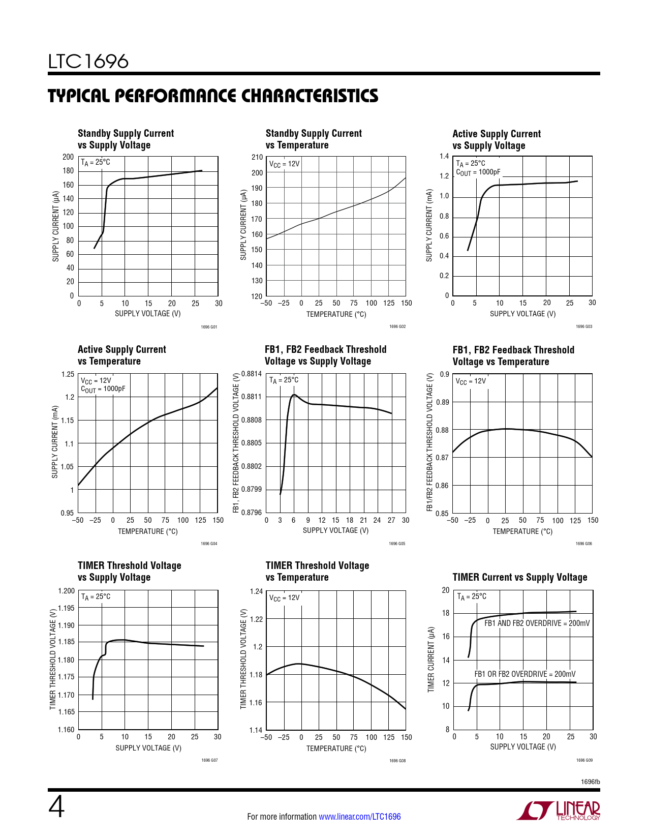 1.200 1.24 20 TA = 25°C VCC = 12V TA = 25°C 1.195 18 1.22 1.190 FB1 AND FB2 OVERDRIVE = 200mV 16 1.185 1.2 1.180 14 1.175 1.18 FB1 OR FB2 OVERDRIVE = 200mV 12 TIMER CURRENT (µA) 1.170 TIMER THRESHOLD VOLTAGE (V) TIMER THRESHOLD VOLTAGE (V) 1.16 10 1.165 1.160 1.14 8 0 5 10 15 20 25 30 –50 –25 0 25 50 75 100 125 150 0 5 10 15 20 25 30 SUPPLY VOLTAGE (V) TEMPERATURE (°C) SUPPLY VOLTAGE (V) 1696 G07 1696 G08 1696 G09 1696fb 4 For more information www.linear.com/LTC1696