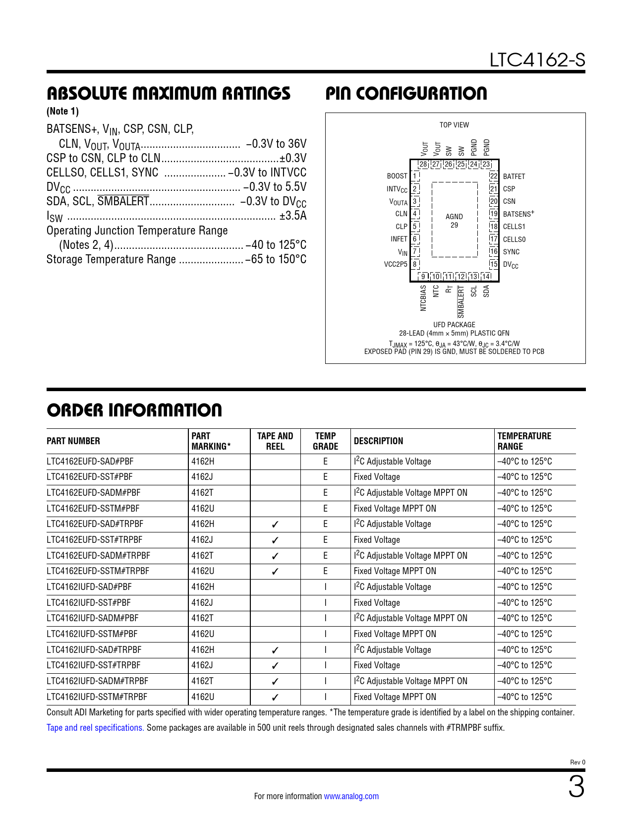 LTC4162-S ABSOLUTE MAXIMUM RATINGSPIN CONFIGURATION(Note 1) BATSENS+, V TOP VIEW IN, CSP, CSN, CLP, CLN, VOUT, VOUTA .. −0.3V to 36V CSP to CSN, CLP to CLN ..±0.3V V OUT V OUT SW SW PGND PGND 28 27 26 25 24 23 CELLSO, CELLS1, SYNC ... −0.3V to INTVCC BOOST 1 22 BATFET DVCC ... −0.3V to 5.5V INTVCC 2 21 CSP SDA, SCL, SMBALERT ... −0.3V to DVCC VOUTA 3 20 CSN ISW ... ±3.5A CLN 4 19 BATSENS+ AGND Operating Junction Temperature Range CLP 5 29 18 CELLS1 (Notes 2, 4) .. −40 to 125°C INFET 6 17 CELLS0 Storage Temperature Range ..−65 to 150°C VIN 7 16 SYNC VCC2P5 8 15 DVCC 9 10 11 12 13 14 R T NTC SCL SDA NTCBIAS SMBALERT UFD PACKAGE 28-LEAD (4mm × 5mm) PLASTIC QFN TJMAX = 125°C, θJA = 43°C/W, θJC = 3.4°C/W EXPOSED PAD (PIN 29) IS GND, MUST BE SOLDERED TO PCB ORDER INFORMATIONPART NUMBERPARTTAPE ANDTEMPMARKING*REELGRADEDESCRIPTIONTEMPERATURERANGE LTC4162EUFD-SAD#PBF 4162H E I2C Adjustable Voltage –40°C to 125°C LTC4162EUFD-SST#PBF 4162J E Fixed Voltage –40°C to 125°C LTC4162EUFD-SADM#PBF 4162T E I2C Adjustable Voltage MPPT ON –40°C to 125°C LTC4162EUFD-SSTM#PBF 4162U E Fixed Voltage MPPT ON –40°C to 125°C LTC4162EUFD-SAD#TRPBF 4162H ✓ E I2C Adjustable Voltage –40°C to 125°C LTC4162EUFD-SST#TRPBF 4162J ✓ E Fixed Voltage –40°C to 125°C LTC4162EUFD-SADM#TRPBF 4162T ✓ E I2C Adjustable Voltage MPPT ON –40°C to 125°C LTC4162EUFD-SSTM#TRPBF 4162U ✓ E Fixed Voltage MPPT ON –40°C to 125°C LTC4162IUFD-SAD#PBF 4162H I I2C Adjustable Voltage –40°C to 125°C LTC4162IUFD-SST#PBF 4162J I Fixed Voltage –40°C to 125°C LTC4162IUFD-SADM#PBF 4162T I I2C Adjustable Voltage MPPT ON –40°C to 125°C LTC4162IUFD-SSTM#PBF 4162U I Fixed Voltage MPPT ON –40°C to 125°C LTC4162IUFD-SAD#TRPBF 4162H ✓ I I2C Adjustable Voltage –40°C to 125°C LTC4162IUFD-SST#TRPBF 4162J ✓ I Fixed Voltage –40°C to 125°C LTC4162IUFD-SADM#TRPBF 4162T ✓ I I2C Adjustable Voltage MPPT ON –40°C to 125°C LTC4162IUFD-SSTM#TRPBF 4162U ✓ I Fixed Voltage MPPT ON –40°C to 125°C Consult ADI Marketing for parts specified with wider operating temperature ranges. *The temperature grade is identified by a label on the shipping container. Tape and reel specifications. Some packages are available in 500 unit reels through designated sales channels with #TRMPBF suffix. Rev 0 For more information www.analog.com 3 Document Outline Features Applications Typical Application Description Absolute Maximum Ratings Order Information Pin Configuration Electrical Characteristics Typical Performance Characteristics Pin Functions Block Diagram ESD Diagram Timing Diagram Operation Applications Information Register Descriptions Typical Applications Package Description Typical Application Related Parts