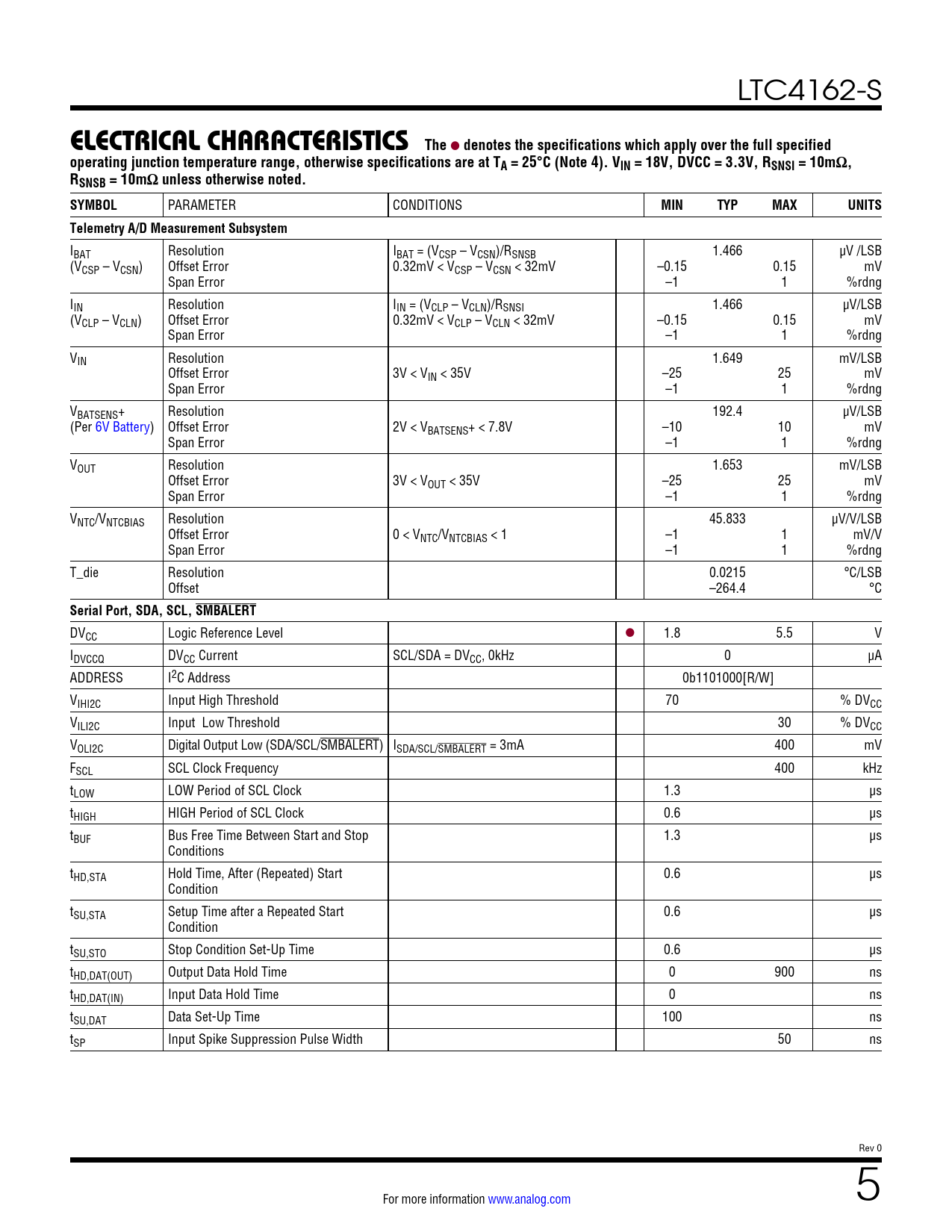 DVCC Logic Reference Level l 1.8 5.5 V IDVCCQ DVCC Current SCL/SDA = DVCC, 0kHz 0 µA ADDRESS I2C Address 0b1101000[R/W] VIHI2C Input High Threshold 70 % DVCC VILI2C Input Low Threshold 30 % DVCC VOLI2C Digital Output Low (SDA/SCL/SMBALERT) ISDA/SCL/SMBALERT = 3mA 400 mV FSCL SCL Clock Frequency 400 kHz tLOW LOW Period of SCL Clock 1.3 µs tHIGH HIGH Period of SCL Clock 0.6 µs tBUF Bus Free Time Between Start and Stop 1.3 µs Conditions tHD,STA Hold Time, After (Repeated) Start 0.6 µs Condition tSU,STA Setup Time after a Repeated Start 0.6 µs Condition tSU,STO Stop Condition Set-Up Time 0.6 µs tHD,DAT(OUT) Output Data Hold Time 0 900 ns tHD,DAT(IN) Input Data Hold Time 0 ns tSU,DAT Data Set-Up Time 100 ns tSP Input Spike Suppression Pulse Width 50 ns Rev 0 For more information www.analog.com 5 Document Outline Features Applications Typical Application Description Absolute Maximum Ratings Order Information Pin Configuration Electrical Characteristics Typical Performance Characteristics Pin Functions Block Diagram ESD Diagram Timing Diagram Operation Applications Information Register Descriptions Typical Applications Package Description Typical Application Related Parts