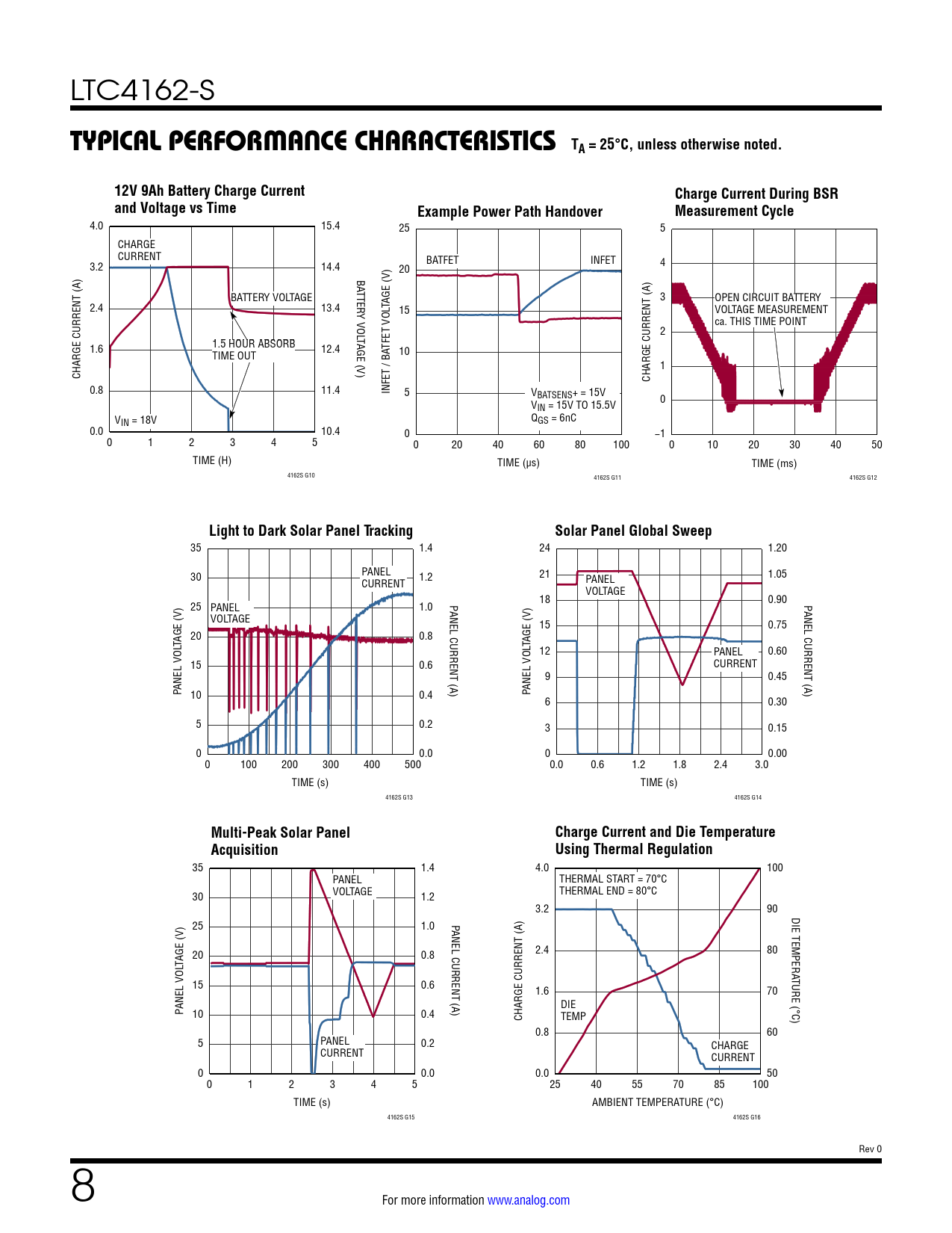 LTC4162-S TYPICAL PERFORMANCE CHARACTERISTICS TA = 25°C, unless otherwise noted.12V 9Ah Battery Charge CurrentCharge Current During BSRand Voltage vs TimeExample Power Path HandoverMeasurement Cycle 4.0 15.4 25 5 CHARGE CURRENT 3.2 14.4 BATFET INFET 4 20 BA T BATTERY VOLTAGE TER 3 OPEN CIRCUIT BAT OPEN CIRCUIT BA TER T Y TER 2.4 13.4 Y VOL TAGE (V) 15 VOLT VOL AGE MEASUREMENT T ca. THIS TIME POINT T 2 AGE (V) 1.6 1.5 HOUR ABSORB 12.4 TFET VOL TIME OUT 10 1 CHARGE CURRENT (A) CHARGE CURRENT (A) 0.8 11.4 INFET / BA 5 VBATSENS+ = 15V V 0 IN = 15V TO 15.5V I V N = 18V QGS = 6nC 0.0 10.4 0 −1 0 1 2 3 4 5 0 20 40 60 80 100 0 10 20 30 40 50 TIME (H) TIME (µs) TIME (ms) 4162S G10 4162S G11 4162S G12 Light to Dark Solar Panel TrackingSolar Panel Global Sweep 35 1.4 24 1.20 30 PANEL 21 1.05 CURRENT 1.2 PANEL VOLTAGE 18 0.90 25 PANEL 1.0 PANEL CURRENT (A) PANEL CURRENT (A) VOLTAGE 15 0.75 20 0.8 TAGE (V) TAGE (V) 12 PANEL 0.60 15 0.6 CURRENT 9 0.45 PANEL VOL 10 0.4 PANEL VOL 6 0.30 5 0.2 3 0.15 0 0.0 0 0.00 0 100 200 300 400 500 0.0 0.6 1.2 1.8 2.4 3.0 TIME (s) TIME (s) 4162S G13 4162S G14 Multi-Peak Solar PanelCharge Current and Die TemperatureAcquisitionUsing Thermal Regulation 35 1.4 4.0 100 PANEL THERMAL START = 70°C 30 VOLTAGE 1.2 THERMAL END = 80°C 3.2 90 DIE TEMPERA 25 1.0 PANEL CURRENT (A) 20 0.8 2.4 80 TAGE (V) TURE (°C) 15 0.6 1.6 70 PANEL VOL DIE 10 0.4 CHARGE CURRENT (A) TEMP 0.8 60 5 PANEL 0.2 CHARGE CURRENT CURRENT 0 0.0 0.0 50 0 1 2 3 4 5 25 40 55 70 85 100 TIME (s) AMBIENT TEMPERATURE (°C) 4162S G15 4162S G16 Rev 0 8 For more information www.analog.com Document Outline Features Applications Typical Application Description Absolute Maximum Ratings Order Information Pin Configuration Electrical Characteristics Typical Performance Characteristics Pin Functions Block Diagram ESD Diagram Timing Diagram Operation Applications Information Register Descriptions Typical Applications Package Description Typical Application Related Parts