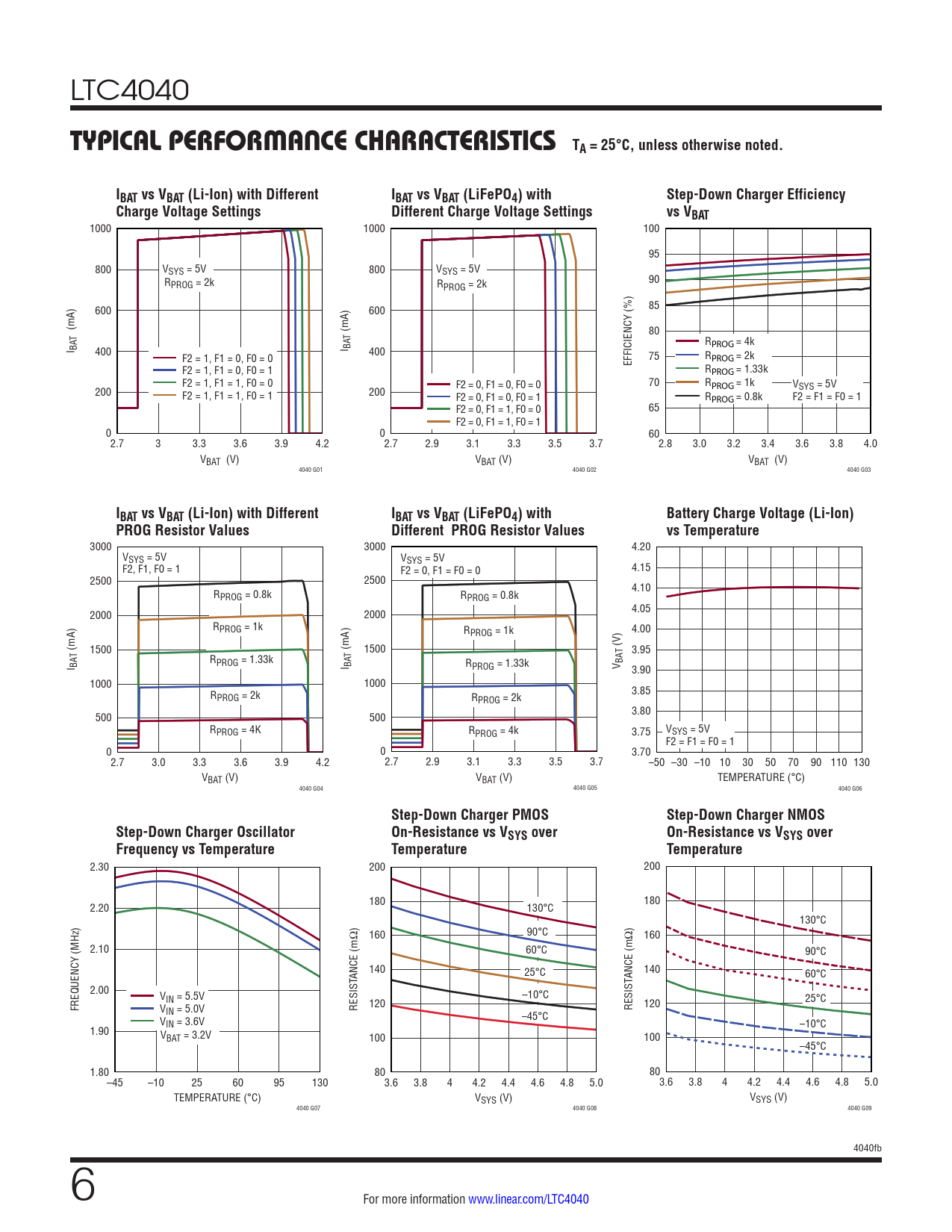 3000 3000 4.20 VSYS = 5V VSYS = 5V F2, F1, F0 = 1 F2 = 0, F1 = F0 = 0 4.15 2500 2500 R 4.10 PROG = 0.8k RPROG = 0.8k 4.05 2000 2000 RPROG = 1k RPROG = 1k 4.00 (mA) 1500 (mA) 1500 (V) 3.95 RPROG = 1.33k I BAT I BAT RPROG = 1.33k V BAT 3.90 1000 1000 R 3.85 PROG = 2k RPROG = 2k 3.80 500 500 RPROG = 4K RPROG = 4k V 3.75 SYS = 5V F2 = F1 = F0 = 1 0 0 3.70 2.7 3.0 3.3 3.6 3.9 4.2 2.7 2.9 3.1 3.3 3.5 3.7 –50 –30 –10 10 30 50 70 90 110 130 VBAT (V) VBAT (V) TEMPERATURE (°C) 4040 G04 4040 G05 4040 G06