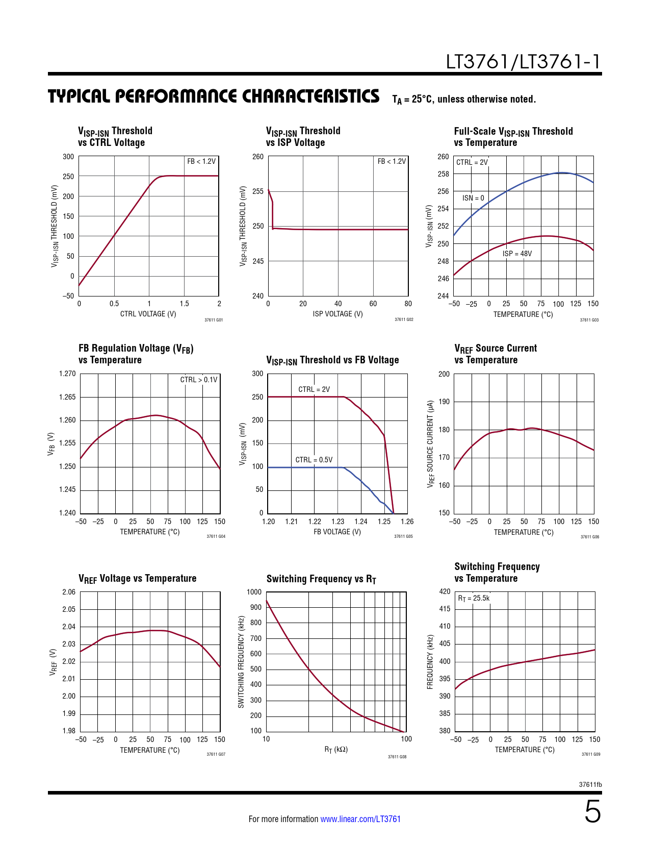 1.270 300 200 CTRL > 0.1V CTRL = 2V 1.265 250 190 1.260 200 180 (V) (mV) 1.255 150 V FB CTRL = 0.5V 170 1.250 V ISP-ISN 100 SOURCE CURRENT (µA) 1.245 50 V REF 160 1.240 0 150 –50 –25 0 25 50 75 100 125 150 1.20 1.21 1.22 1.23 1.24 1.25 1.26 –50 –25 0 25 50 75 100 125 150 TEMPERATURE (°C) FB VOLTAGE (V) TEMPERATURE (°C) 37611 G04 37611 G05 37611 G06