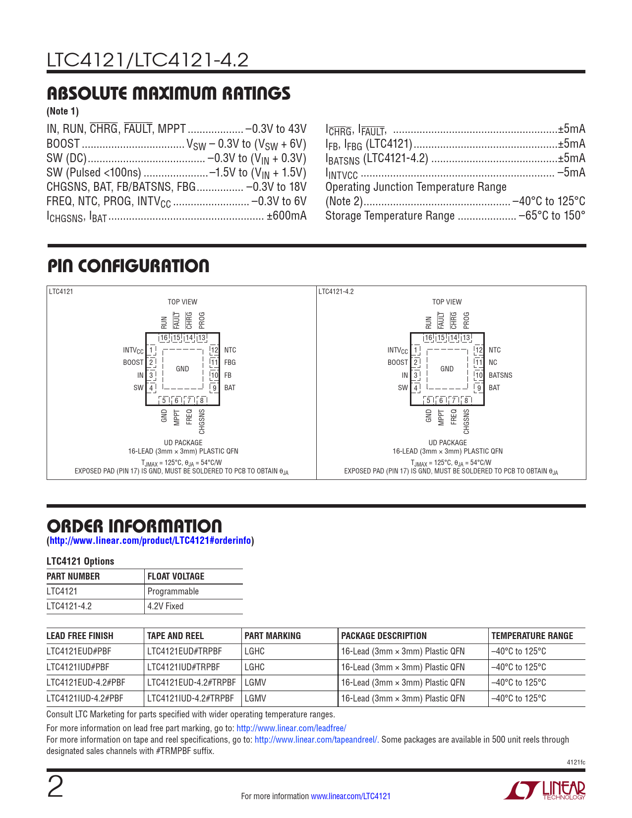 ABSOLUTE MAXIMUM RATINGS (Note 1). PIN CONFIGURATION. ORDER INFORMATION. (http://www.linear.com/product/LTC4121#orderinfo)