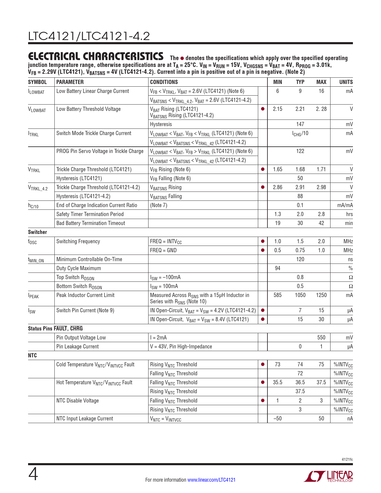denotes the specifications which apply over the specified operating junction temperature range, otherwise specifications are at TA = 25°C. VIN = VRUN = 15V, VCHGSNS = VBAT = 4V, RPROG = 3.01k, VFB = 2.29V (LTC4121), VBATSNS = 4V (LTC4121-4.2). Current into a pin is positive out of a pin is negative. (Note 2) SYMBOL PARAMETER CONDITIONS MIN TYP MAX UNITS