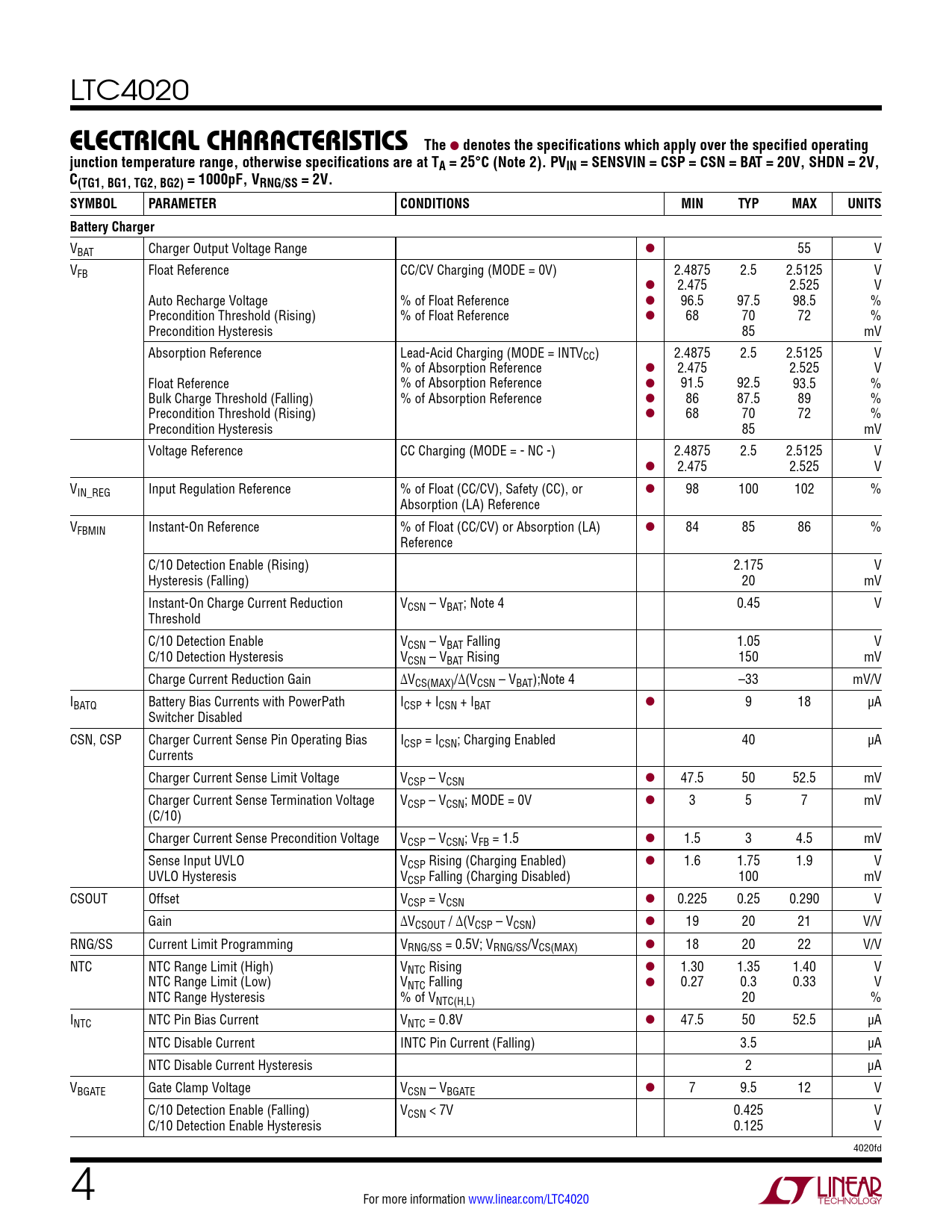 LTC4020 e lecTrical characTerisTics The l denotes the specifications which apply over the specified operatingjunction temperature range, otherwise specifications are at TA = 25°C (Note 2). PVIN = SENSVIN = CSP = CSN = BAT = 20V, SHDN = 2V,C(TG1, BG1, TG2, BG2) = 1000pF, VRNG/SS = 2V.SYMBOLPARAMETERCONDITIONSMINTYPMAXUNITSBattery Charger VBAT Charger Output Voltage Range l 55 V VFB Float Reference CC/CV Charging (MODE = 0V) 2.4875 2.5 2.5125 V l 2.475 2.525 V Auto Recharge Voltage % of Float Reference l 96.5 97.5 98.5 % Precondition Threshold (Rising) % of Float Reference l 68 70 72 % Precondition Hysteresis 85 mV Absorption Reference Lead-Acid Charging (MODE = INTVCC) 2.4875 2.5 2.5125 V % of Absorption Reference l 2.475 2.525 V Float Reference % of Absorption Reference l 91.5 92.5 93.5 % Bulk Charge Threshold (Falling) % of Absorption Reference l 86 87.5 89 % Precondition Threshold (Rising) l 68 70 72 % Precondition Hysteresis 85 mV Voltage Reference CC Charging (MODE = - NC -) 2.4875 2.5 2.5125 V l 2.475 2.525 V VIN_REG Input Regulation Reference % of Float (CC/CV), Safety (CC), or l 98 100 102 % Absorption (LA) Reference VFBMIN Instant-On Reference % of Float (CC/CV) or Absorption (LA) l 84 85 86 % Reference C/10 Detection Enable (Rising) 2.175 V Hysteresis (Falling) 20 mV Instant-On Charge Current Reduction VCSN – VBAT; Note 4 0.45 V Threshold C/10 Detection Enable VCSN – VBAT Falling 1.05 V C/10 Detection Hysteresis VCSN – VBAT Rising 150 mV Charge Current Reduction Gain ΔVCS(MAX)/Δ(VCSN – VBAT);Note 4 –33 mV/V IBATQ Battery Bias Currents with PowerPath ICSP + ICSN + IBAT l 9 18 µA Switcher Disabled CSN, CSP Charger Current Sense Pin Operating Bias ICSP = ICSN; Charging Enabled 40 µA Currents Charger Current Sense Limit Voltage VCSP – VCSN l 47.5 50 52.5 mV Charger Current Sense Termination Voltage VCSP – VCSN; MODE = 0V l 3 5 7 mV (C/10) Charger Current Sense Precondition Voltage VCSP – VCSN; VFB = 1.5 l 1.5 3 4.5 mV Sense Input UVLO VCSP Rising (Charging Enabled) l 1.6 1.75 1.9 V UVLO Hysteresis VCSP Falling (Charging Disabled) 100 mV CSOUT Offset VCSP = VCSN l 0.225 0.25 0.290 V Gain ΔVCSOUT / Δ(VCSP – VCSN) l 19 20 21 V/V RNG/SS Current Limit Programming VRNG/SS = 0.5V; VRNG/SS/VCS(MAX) l 18 20 22 V/V NTC NTC Range Limit (High) VNTC Rising l 1.30 1.35 1.40 V NTC Range Limit (Low) VNTC Falling l 0.27 0.3 0.33 V NTC Range Hysteresis % of VNTC(H,L) 20 % INTC NTC Pin Bias Current VNTC = 0.8V l 47.5 50 52.5 µA NTC Disable Current INTC Pin Current (Falling) 3.5 µA NTC Disable Current Hysteresis 2 µA VBGATE Gate Clamp Voltage VCSN – VBGATE l 7 9.5 12 V C/10 Detection Enable (Falling) VCSN < 7V 0.425 V C/10 Detection Enable Hysteresis 0.125 V 4020fd 4 For more information www.linear.com/LTC4020 Document Outline Features Applications Typical Application Description Absolute Maximum Ratings Order Information Electrical Characteristics Pin Configuration Electrical Characteristics Pin Functions Block Diagram Operation Applications Information Package Description Revision History Typical Application Related Parts