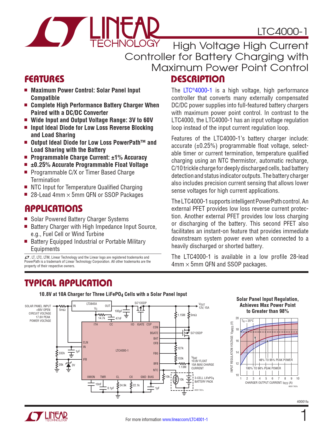 LTC4000-1 High Voltage High Current Controller for Battery Charging with Maximum Power Point Control FeaTuresDescripTion n Maximum Power Control: Solar Panel Input The LTC®4000-1 is a high voltage, high performance Compatible controller that converts many externally compensated n Complete High Performance Battery Charger When DC/DC power supplies into full-featured battery chargers Paired with a DC/DC Converter with maximum power point control. In contrast to the n Wide Input and Output Voltage Range: 3V to 60V LTC4000, the LTC4000-1 has an input voltage regulation n Input Ideal Diode for Low Loss Reverse Blocking loop instead of the input current regulation loop. and Load Sharing Features of the LTC4000-1’s battery charger include: n Output Ideal Diode for Low Loss PowerPath™ and accurate (±0.25%) programmable float voltage, select- Load Sharing with the Battery able timer or current termination, temperature qualified n Programmable Charge Current: ±1% Accuracy charging using an NTC thermistor, automatic recharge, n ±0.25% Accurate Programmable Float Voltage C/10 trickle charge for deeply discharged cells, bad battery n Programmable C/X or Timer Based Charge detection and status indicator outputs. The battery charger Termination also includes precision current sensing that allows lower n NTC Input for Temperature Qualified Charging sense voltages for high current applications. n 28-Lead 4mm × 5mm QFN or SSOP Packages The LTC4000-1 supports intelligent PowerPath control. An applicaTions external PFET provides low loss reverse current protec- n tion. Another external PFET provides low loss charging Solar Powered Battery Charger Systems n or discharging of the battery. This second PFET also Battery Charger with High Impedance Input Source, facilitates an instant-on feature that provides immediate e.g., Fuel Cell or Wind Turbine n downstream system power even when connected to a Battery Equipped Industrial or Portable Military heavily discharged or shorted battery. Equipments L, LT, LTC, LTM, Linear Technology and the Linear logo are registered trademarks and The LTC4000-1 is available in a low profile 28-lead PowerPath is a trademark of Linear Technology Corporation. All other trademarks are the property of their respective owners. 4mm × 5mm QFN and SSOP packages. Typical applicaTion10.8V at 10A Charger for Three LiFePO4 Cells with a Solar Panel InputSolar Panel Input Regulation, Si7135DP LT3845A VOUT SOLAR PANEL INPUT IN OUT Achieves Max Power Point 12V, 15A <60V OPEN 5mΩ VC 100µF to Greater than 98% CIRCUIT VOLTAGE 1.15M 5mΩ 17.6V PEAK 14.7k 47nF 20 POWER VOLTAGE TA = 25°C ITH CC IID IGATE CSP (V) CSN 18 BGATE Si7135DP INREG BAT CLN TAGE: V 16 OFB IN 127k 1µF LTC4000-1 332k FBG TION VOL 14 V 133k BAT IFB 10.8V FLOAT 98% TO 95% PEAK POWER BFB 20k 3V 10A MAX CHARGE 12 1.13M CURRENT 100% TO 98% PEAK POWER NTC INPUT REGULA 10 IIMON TMR CL CX GND BIAS 10k 10k 3-CELL LiFePO4 1 2 3 4 5 6 7 8 9 10 BATTERY PACK 10nF CHARGER OUTPUT CURRENT: I 24.9k 22.1k RCS (A) 0.1µF 1µF 40001 TA01b 40001 TA01a 40001fa For more information www.linear.com/LTC4001-1 1 Document Outline Features Applications Description Typical Application Absolute Maximum Ratings Pin Configuration Order Information Electrical Characteristics Typical Performance Characteristics Pin Functions Block Diagram Operation Applications Information Typical Applications Package Description Typical Application Related Parts