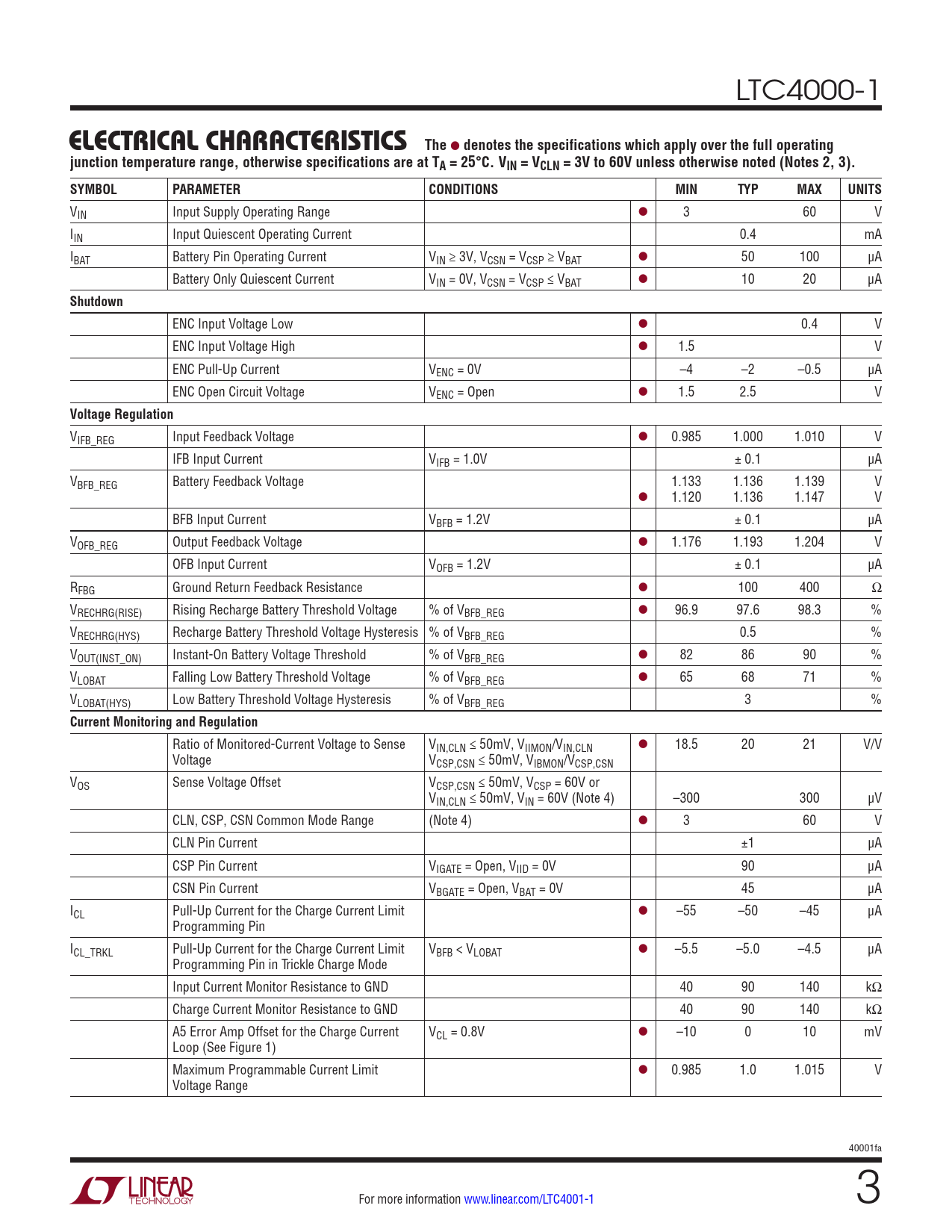 LTC4000-1 e lecTrical characTerisTics The l denotes the specifications which apply over the full operatingjunction temperature range, otherwise specifications are at TA = 25°C. VIN = VCLN = 3V to 60V unless otherwise noted (Notes 2, 3). SYMBOLPARAMETERCONDITIONSMINTYPMAXUNITS VIN Input Supply Operating Range l 3 60 V IIN Input Quiescent Operating Current 0.4 mA IBAT Battery Pin Operating Current VIN ≥ 3V, VCSN = VCSP ≥ VBAT l 50 100 µA Battery Only Quiescent Current VIN = 0V, VCSN = VCSP ≤ VBAT l 10 20 μA Shutdown ENC Input Voltage Low l 0.4 V ENC Input Voltage High l 1.5 V ENC Pull-Up Current VENC = 0V –4 –2 –0.5 µA ENC Open Circuit Voltage VENC = Open l 1.5 2.5 V Voltage Regulation VIFB_REG Input Feedback Voltage l 0.985 1.000 1.010 V IFB Input Current VIFB = 1.0V ± 0.1 µA VBFB_REG Battery Feedback Voltage 1.133 1.136 1.139 V l 1.120 1.136 1.147 V BFB Input Current VBFB = 1.2V ± 0.1 µA VOFB_REG Output Feedback Voltage l 1.176 1.193 1.204 V OFB Input Current VOFB = 1.2V ± 0.1 µA RFBG Ground Return Feedback Resistance l 100 400 Ω VRECHRG(RISE) Rising Recharge Battery Threshold Voltage % of VBFB_REG l 96.9 97.6 98.3 % VRECHRG(HYS) Recharge Battery Threshold Voltage Hysteresis % of VBFB_REG 0.5 % VOUT(INST_ON) Instant-On Battery Voltage Threshold % of VBFB_REG l 82 86 90 % VLOBAT Falling Low Battery Threshold Voltage % of VBFB_REG l 65 68 71 % VLOBAT(HYS) Low Battery Threshold Voltage Hysteresis % of VBFB_REG 3 % Current Monitoring and Regulation Ratio of Monitored-Current Voltage to Sense VIN,CLN ≤ 50mV, VIIMON/VIN,CLN l 18.5 20 21 V/V Voltage VCSP,CSN ≤ 50mV, VIBMON/VCSP,CSN VOS Sense Voltage Offset VCSP,CSN ≤ 50mV, VCSP = 60V or VIN,CLN ≤ 50mV, VIN = 60V (Note 4) –300 300 µV CLN, CSP, CSN Common Mode Range (Note 4) l 3 60 V CLN Pin Current ±1 µA CSP Pin Current VIGATE = Open, VIID = 0V 90 μA CSN Pin Current VBGATE = Open, VBAT = 0V 45 μA ICL Pull-Up Current for the Charge Current Limit l –55 –50 –45 μA Programming Pin ICL_TRKL Pull-Up Current for the Charge Current Limit VBFB < VLOBAT l –5.5 –5.0 –4.5 μA Programming Pin in Trickle Charge Mode Input Current Monitor Resistance to GND 40 90 140 kΩ Charge Current Monitor Resistance to GND 40 90 140 kΩ A5 Error Amp Offset for the Charge Current VCL = 0.8V l –10 0 10 mV Loop (See Figure 1) Maximum Programmable Current Limit l 0.985 1.0 1.015 V Voltage Range 40001fa For more information www.linear.com/LTC4001-1 3 Document Outline Features Applications Description Typical Application Absolute Maximum Ratings Pin Configuration Order Information Electrical Characteristics Typical Performance Characteristics Pin Functions Block Diagram Operation Applications Information Typical Applications Package Description Typical Application Related Parts