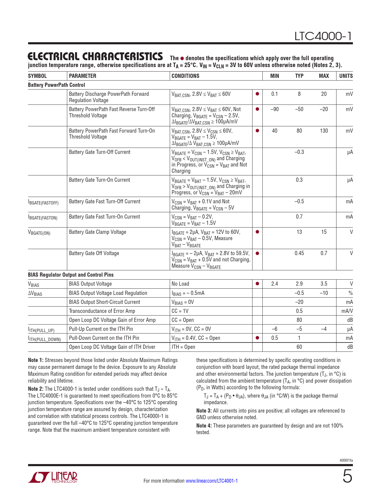 The LTC4000-1 is tested under conditions such that T (P J ≈ TA. D, in Watts) according to the following formula: The LTC4000E-1 is guaranteed to meet specifications from 0°C to 85°C TJ = TA + (PD • θJA), where θJA (in °C/W) is the package thermal junction temperature. Specifications over the –40°C to 125°C operating impedance. junction temperature range are assured by design, characterization