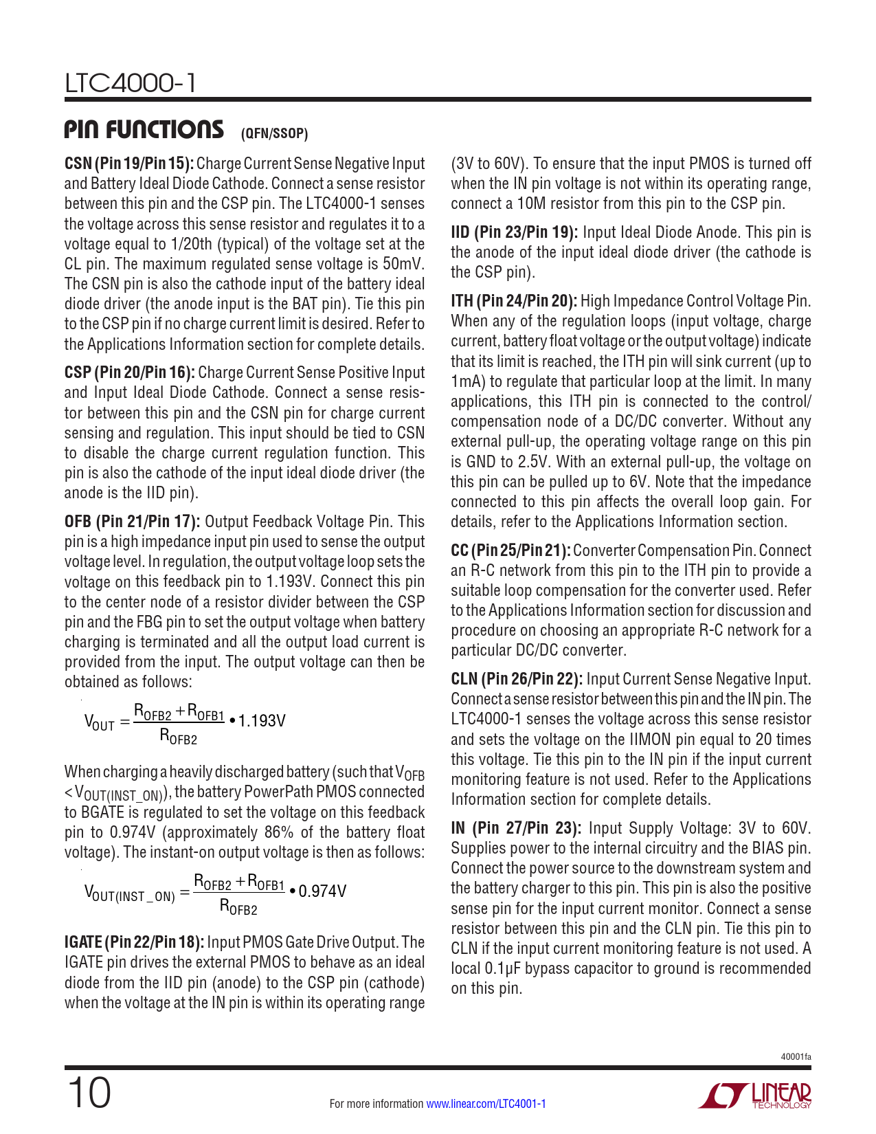 Charge Current Sense Negative Input (3V to 60V). To ensure that the input PMOS is turned off and Battery Ideal Diode Cathode. Connect a sense resistor when the IN pin voltage is not within its operating range, between this pin and the CSP pin. The LTC4000-1 senses connect a 10M resistor from this pin to the CSP pin. the voltage across this sense resistor and regulates it to a