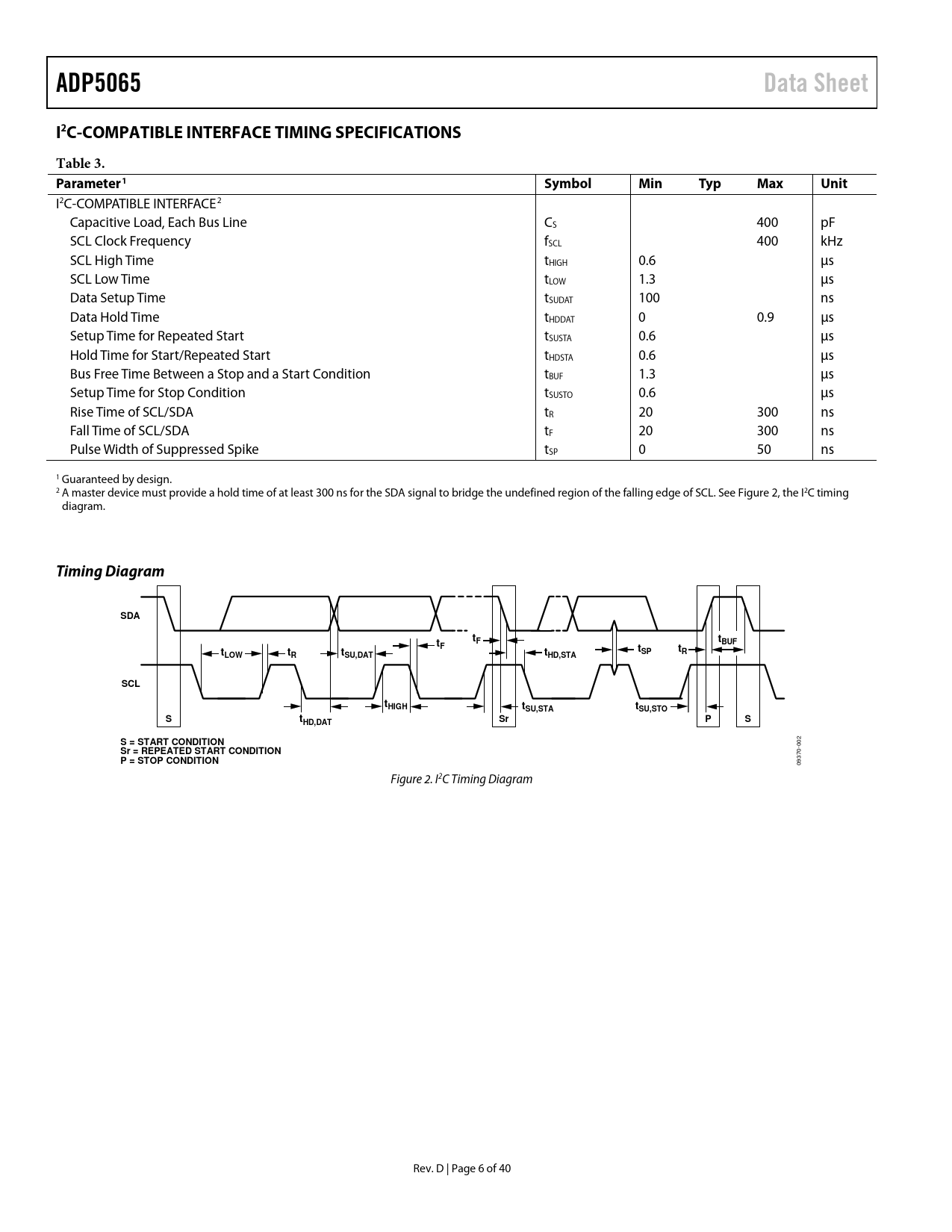 ADP5065. Data Sheet. I2C-COMPATIBLE INTERFACE TIMING SPECIFICATIONS. Table 3. Parameter1. Symbol. Min. Typ. Max. Unit. Timing Diagram. SDA