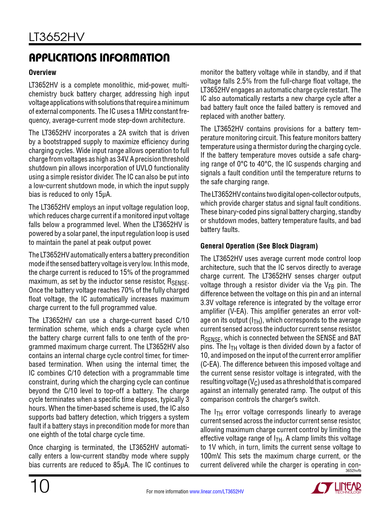 LT3652HV APPLICATIONS INFORMATION Overview monitor the battery voltage while in standby, and if that LT3652HV is a complete monolithic, mid-power, multi- voltage falls 2.5% from the full-charge float voltage, the chemistry buck battery charger, addressing high input LT3652HV engages an automatic charge cycle restart. The voltage applications with solutions that require a minimum IC also automatically restarts a new charge cycle after a of external components. The IC uses a 1MHz constant fre- bad battery fault once the failed battery is removed and quency, average-current mode step-down architecture. replaced with another battery. The LT3652HV incorporates a 2A switch that is driven The LT3652HV contains provisions for a battery tem- by a bootstrapped supply to maximize efficiency during perature monitoring circuit. This feature monitors battery charging cycles. Wide input range allows operation to full temperature using a thermistor during the charging cycle. charge from voltages as high as 34V. A precision threshold If the battery temperature moves outside a safe charg- shutdown pin allows incorporation of UVLO functionality ing range of 0°C to 40°C, the IC suspends charging and using a simple resistor divider. The IC can also be put into signals a fault condition until the temperature returns to a low-current shutdown mode, in which the input supply the safe charging range. bias is reduced to only 15µA. The LT3652HV contains two digital open-collector outputs, The LT3652HV employs an input voltage regulation loop, which provide charger status and signal fault conditions. which reduces charge current if a monitored input voltage These binary-coded pins signal battery charging, standby falls below a programmed level. When the LT3652HV is or shutdown modes, battery temperature faults, and bad powered by a solar panel, the input regulation loop is used battery faults. to maintain the panel at peak output power. General Operation (See Block Diagram) The LT3652HV automatically enters a battery precondition The LT3652HV uses average current mode control loop mode if the sensed battery voltage is very low. In this mode, architecture, such that the IC servos directly to average the charge current is reduced to 15% of the programmed charge current. The LT3652HV senses charger output maximum, as set by the inductor sense resistor, RSENSE. voltage through a resistor divider via the V Once the battery voltage reaches 70% of the fully charged FB pin. The difference between the voltage on this pin and an internal float voltage, the IC automatically increases maximum 3.3V voltage reference is integrated by the voltage error charge current to the full programmed value. amplifier (V-EA). This amplifier generates an error volt- The LT3652HV can use a charge-current based C/10 age on its output (ITH), which corresponds to the average termination scheme, which ends a charge cycle when current sensed across the inductor current sense resistor, the battery charge current falls to one tenth of the pro- RSENSE, which is connected between the SENSE and BAT grammed maximum charge current. The LT3652HV also pins. The ITH voltage is then divided down by a factor of contains an internal charge cycle control timer, for timer- 10, and imposed on the input of the current error amplifier based termination. When using the internal timer, the (C-EA). The difference between this imposed voltage and IC combines C/10 detection with a programmable time the current sense resistor voltage is integrated, with the constraint, during which the charging cycle can continue resulting voltage (VC) used as a threshold that is compared beyond the C/10 level to top-off a battery. The charge against an internally generated ramp. The output of this cycle terminates when a specific time elapses, typically 3 comparison controls the charger’s switch. hours. When the timer-based scheme is used, the IC also The I supports bad battery detection, which triggers a system TH error voltage corresponds linearly to average current sensed across the inductor current sense resistor, fault if a battery stays in precondition mode for more than allowing maximum charge current control by limiting the one eighth of the total charge cycle time. effective voltage range of ITH. A clamp limits this voltage Once charging is terminated, the LT3652HV automati- to 1V which, in turn, limits the current sense voltage to cally enters a low-current standby mode where supply 100mV. This sets the maximum charge current, or the bias currents are reduced to 85µA. The IC continues to current delivered while the charger is operating in con- 3652hvfb 10 For more information www.linear.com/LT3652HV Document Outline Features Applications Description Typical Application Absolute Maximum Ratings Pin Configuration Order Information Electrical Characteristics Typical Performance Characteristics Pin Functions Block Diagram Applications Information Typical Applications Package Description Revision History Typical Application Related Parts