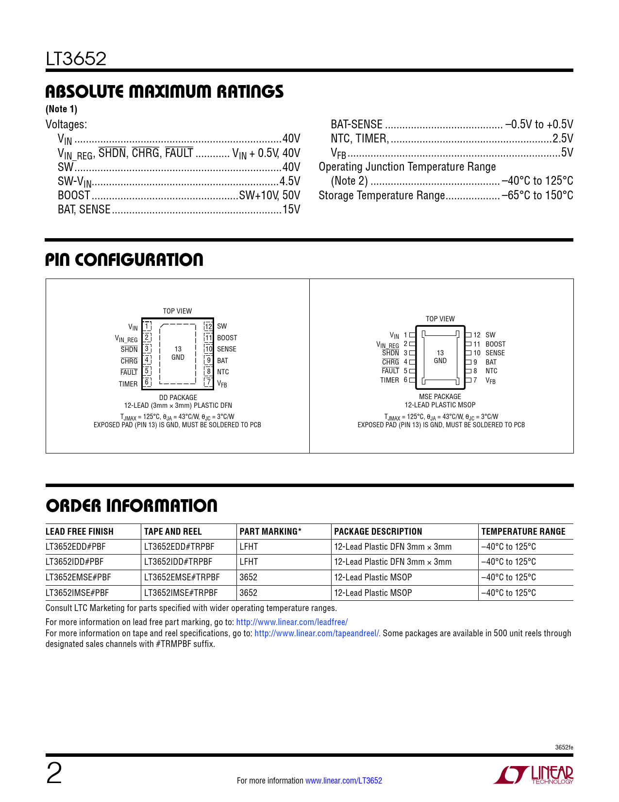 LT3652EDD#PBF LT3652EDD#TRPBF LFHT 12-Lead Plastic DFN 3mm × 3mm –40°C to 125°C LT3652IDD#PBF LT3652IDD#TRPBF LFHT 12-Lead Plastic DFN 3mm × 3mm –40°C to 125°C LT3652EMSE#PBF LT3652EMSE#TRPBF 3652 12-Lead Plastic MSOP –40°C to 125°C LT3652IMSE#PBF LT3652IMSE#TRPBF 3652 12-Lead Plastic MSOP –40°C to 125°C Consult LTC Marketing for parts specified with wider operating temperature ranges. For more information on lead free part marking, go to: http://www.linear.com/leadfree/ For more information on tape and reel specifications, go to: http://www.linear.com/tapeandreel/. Some packages are available in 500 unit reels through designated sales channels with #TRMPBF suffix. 3652fe 2 For more information www.linear.com/LT3652 Document Outline Description Typical Application Absolute Maximum Ratings Pin Configuration Electrical Characteristics Typical Performance Characteristics Pin Functions Block Diagram Applications Information Package Description Typical Application Related Parts