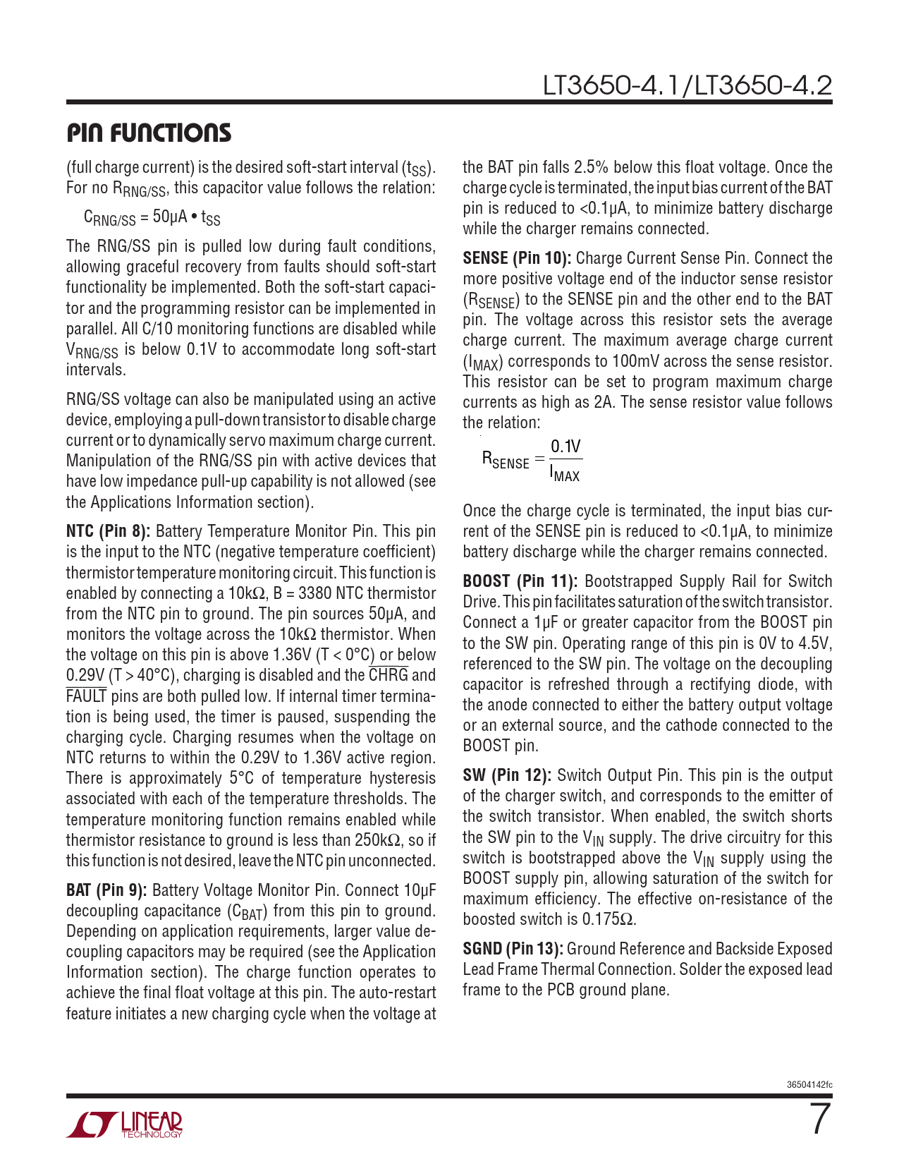 LT3650-4.1/LT3650-4.2 pin FuncTions (full charge current) is the desired soft-start interval (tSS). the BAT pin falls 2.5% below this float voltage. Once the For no RRNG/SS, this capacitor value follows the relation: charge cycle is terminated, the input bias current of the BAT C pin is reduced to <0.1µA, to minimize battery discharge RNG/SS = 50µA • tSS while the charger remains connected. The RNG/SS pin is pulled low during fault conditions, allowing graceful recovery from faults should soft-start SENSE (Pin 10): Charge Current Sense Pin. Connect the functionality be implemented. Both the soft-start capaci- more positive voltage end of the inductor sense resistor tor and the programming resistor can be implemented in (RSENSE) to the SENSE pin and the other end to the BAT parallel. All C/10 monitoring functions are disabled while pin. The voltage across this resistor sets the average V charge current. The maximum average charge current RNG/SS is below 0.1V to accommodate long soft-start intervals. (IMAX) corresponds to 100mV across the sense resistor. This resistor can be set to program maximum charge RNG/SS voltage can also be manipulated using an active currents as high as 2A. The sense resistor value follows device, employing a pull-down transistor to disable charge the relation: current or to dynamically servo maximum charge current. 0.1V Manipulation of the RNG/SS pin with active devices that RSENSE = have low impedance pull-up capability is not allowed (see IMAX the Applications Information section). Once the charge cycle is terminated, the input bias cur- NTC (Pin 8): Battery Temperature Monitor Pin. This pin rent of the SENSE pin is reduced to <0.1µA, to minimize is the input to the NTC (negative temperature coefficient) battery discharge while the charger remains connected. thermistor temperature monitoring circuit. This function is BOOST (Pin 11): Bootstrapped Supply Rail for Switch enabled by connecting a 10kΩ, B = 3380 NTC thermistor Drive. This pin facilitates saturation of the switch transistor. from the NTC pin to ground. The pin sources 50µA, and Connect a 1µF or greater capacitor from the BOOST pin monitors the voltage across the 10kΩ thermistor. When to the SW pin. Operating range of this pin is 0V to 4.5V, the voltage on this pin is above 1.36V (T < 0°C) or below referenced to the SW pin. The voltage on the decoupling 0.29V (T > 40°C), charging is disabled and the CHRG and capacitor is refreshed through a rectifying diode, with FAULT pins are both pulled low. If internal timer termina- the anode connected to either the battery output voltage tion is being used, the timer is paused, suspending the or an external source, and the cathode connected to the charging cycle. Charging resumes when the voltage on BOOST pin. NTC returns to within the 0.29V to 1.36V active region. There is approximately 5°C of temperature hysteresis SW (Pin 12): Switch Output Pin. This pin is the output associated with each of the temperature thresholds. The of the charger switch, and corresponds to the emitter of temperature monitoring function remains enabled while the switch transistor. When enabled, the switch shorts thermistor resistance to ground is less than 250kΩ, so if the SW pin to the VIN supply. The drive circuitry for this this function is not desired, leave the NTC pin unconnected. switch is bootstrapped above the VIN supply using the BOOST supply pin, allowing saturation of the switch for BAT (Pin 9): Battery Voltage Monitor Pin. Connect 10µF maximum efficiency. The effective on-resistance of the decoupling capacitance (CBAT) from this pin to ground. boosted switch is 0.175Ω. Depending on application requirements, larger value de- coupling capacitors may be required (see the Application SGND (Pin 13): Ground Reference and Backside Exposed Information section). The charge function operates to Lead Frame Thermal Connection. Solder the exposed lead achieve the final float voltage at this pin. The auto-restart frame to the PCB ground plane. feature initiates a new charging cycle when the voltage at 36504142fc 7 Document Outline Features Applications Description Typical Application Absolute Maximum Ratings Pin Configuration Order Information Electrical Characteristics Typical Performance Characteristics Pin Functions Block Diagram Operation Applications Information Typical Applications Package Description Revision History Typical Application Related Parts