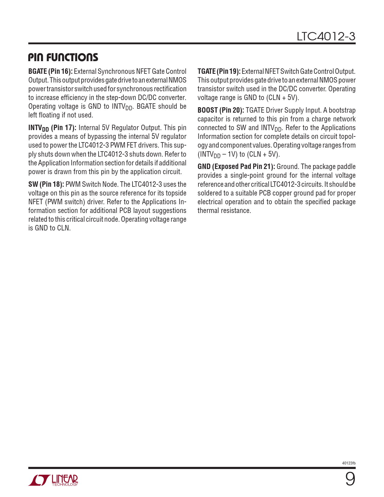 LTC4012-3 pin FuncTions BGATE (Pin 16): External Synchronous NFET Gate Control TGATE (Pin 19): External NFET Switch Gate Control Output. Output. This output provides gate drive to an external NMOS This output provides gate drive to an external NMOS power power transistor switch used for synchronous rectification transistor switch used in the DC/DC converter. Operating to increase efficiency in the step-down DC/DC converter. voltage range is GND to (CLN + 5V). Operating voltage is GND to INTVDD. BGATE should be BOOST (Pin 20): TGATE Driver Supply Input. A bootstrap left floating if not used. capacitor is returned to this pin from a charge network INTVDD (Pin 17): Internal 5V Regulator Output. This pin connected to SW and INTVDD. Refer to the Applications provides a means of bypassing the internal 5V regulator Information section for complete details on circuit topol- used to power the LTC4012-3 PWM FET drivers. This sup- ogy and component values. Operating voltage ranges from ply shuts down when the LTC4012-3 shuts down. Refer to (INTVDD – 1V) to (CLN + 5V). the Application Information section for details if additional GND (Exposed Pad Pin 21): Ground. The package paddle power is drawn from this pin by the application circuit. provides a single-point ground for the internal voltage SW (Pin 18): PWM Switch Node. The LTC4012-3 uses the reference and other critical LTC4012-3 circuits. It should be voltage on this pin as the source reference for its topside soldered to a suitable PCB copper ground pad for proper NFET (PWM switch) driver. Refer to the Applications In- electrical operation and to obtain the specified package formation section for additional PCB layout suggestions thermal resistance. related to this critical circuit node. Operating voltage range is GND to CLN. 40123fb Document Outline Features Applications Description Typical Application Absolute Maximum Ratings Pin Configuration Order Information Electrical Characteristics Typical Performance Characteristics Pin Functions Block Diagram Test Circuits Operation Applications Information Package Description Revision History Typical Application Related Parts