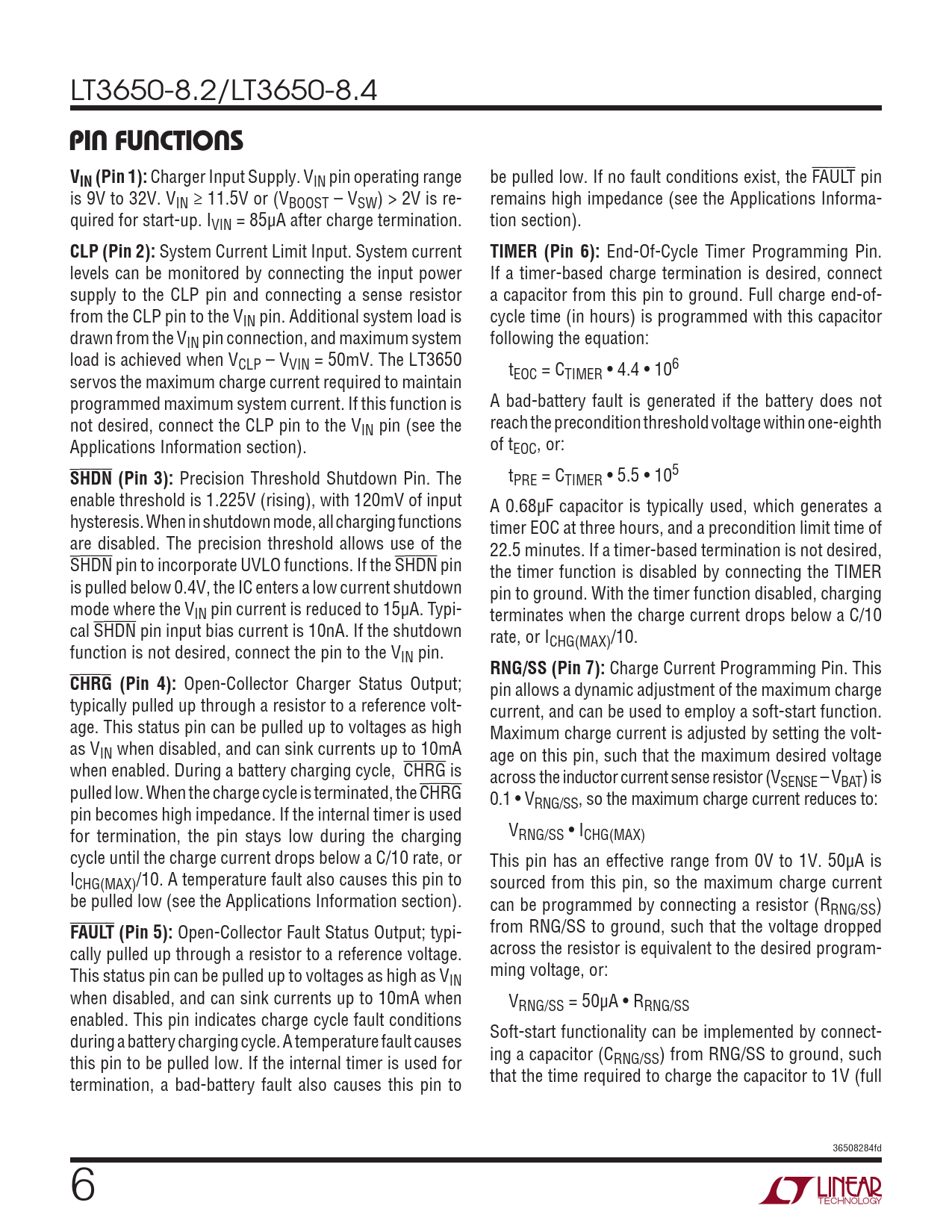 End-Of-Cycle Timer Programming Pin. levels can be monitored by connecting the input power If a timer-based charge termination is desired, connect supply to the CLP pin and connecting a sense resistor a capacitor from this pin to ground. Full charge end-of- from the CLP pin to the VIN pin. Additional system load is cycle time (in hours) is programmed with this capacitor drawn from the VIN pin connection, and maximum system following the equation: load is achieved when VCLP – VVIN = 50mV. The LT3650 t servos the maximum charge current required to maintain EOC = CTIMER • 4.4 • 106 programmed maximum system current. If this function is A bad-battery fault is generated if the battery does not not desired, connect the CLP pin to the VIN pin (see the reach the precondition threshold voltage within one-eighth Applications Information section). of tEOC, or: