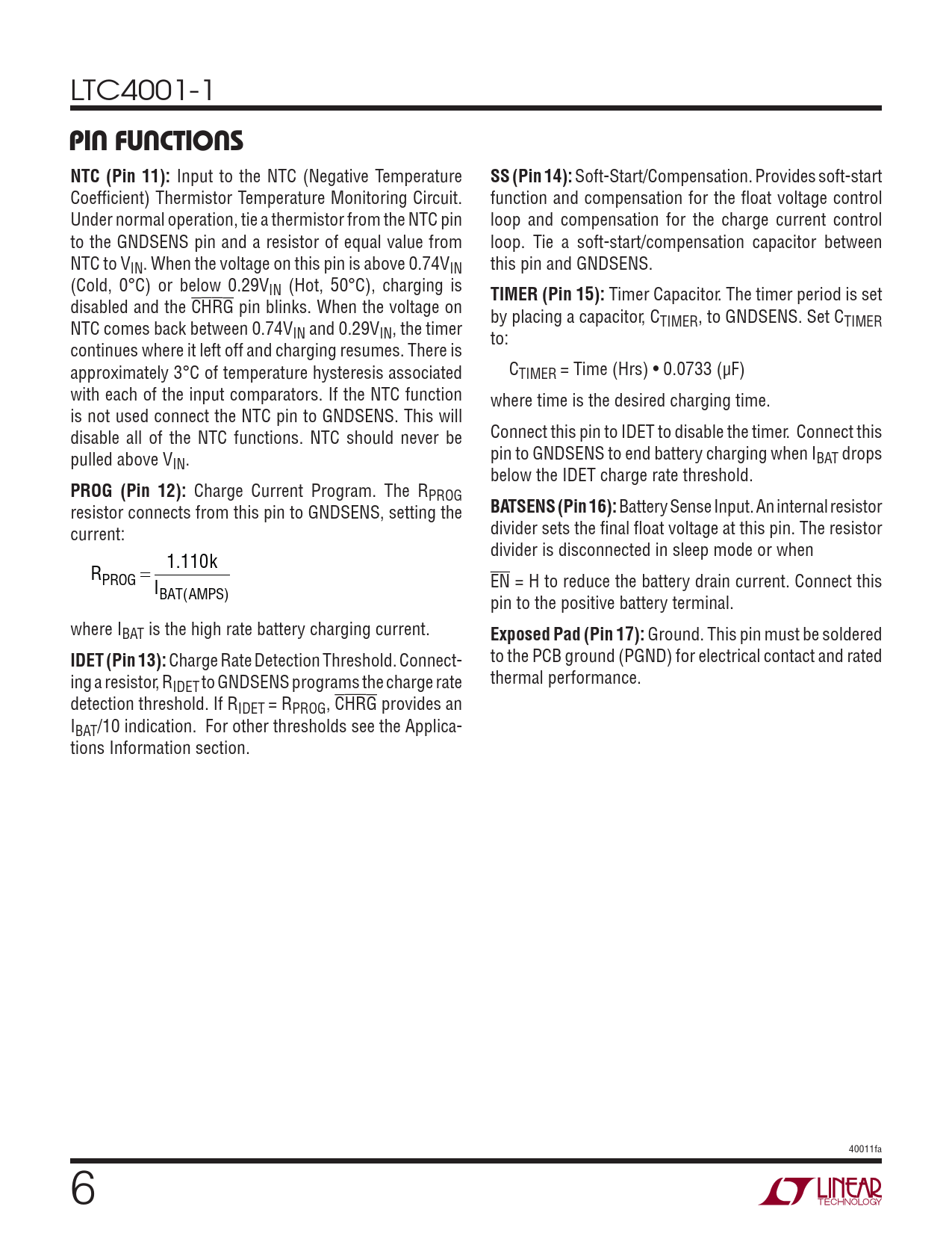 PIN FUNCTIONS. NTC (Pin 11):. SS (Pin 14):. TIMER (Pin 15):. PROG (Pin 12):. BATSENS (Pin 16):. Exposed Pad (Pin 17):. IDET (Pin 13):