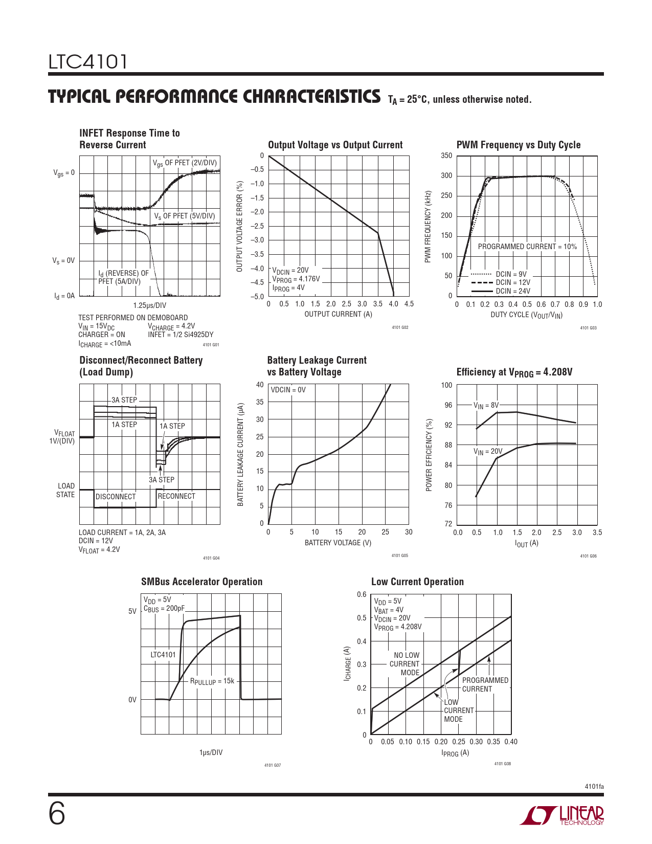 0.6 VDD = 5V VDD = 5V 5V CBUS = 200pF VBAT = 4V 0.5 VDCIN = 20V VPROG = 4.208V 0.4 LTC4101 (A) NO LOW 0.3 CURRENT MODE R I CHARGE PULLUP = 15k PROGRAMMED 0.2 CURRENT 0V LOW 0.1 CURRENT MODE 0 0 0.05 0.10 0.15 0.20 0.25 0.30 0.35 0.40 1μs/DIV IPROG (A) 4101 G07 4101 G08 4101fa 6
