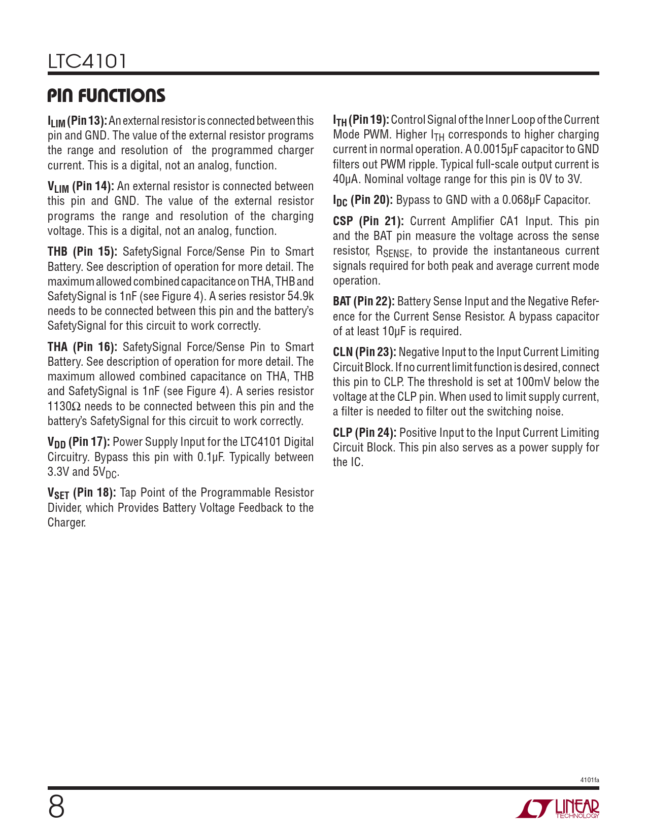 PIN FUNCTIONS. ILIM (Pin 13):. ITH (Pin 19):. VLIM (Pin 14):. IDC (Pin 20):. CSP (Pin 21):. THB (Pin 15):. BAT (Pin 22):. THA (Pin 16):