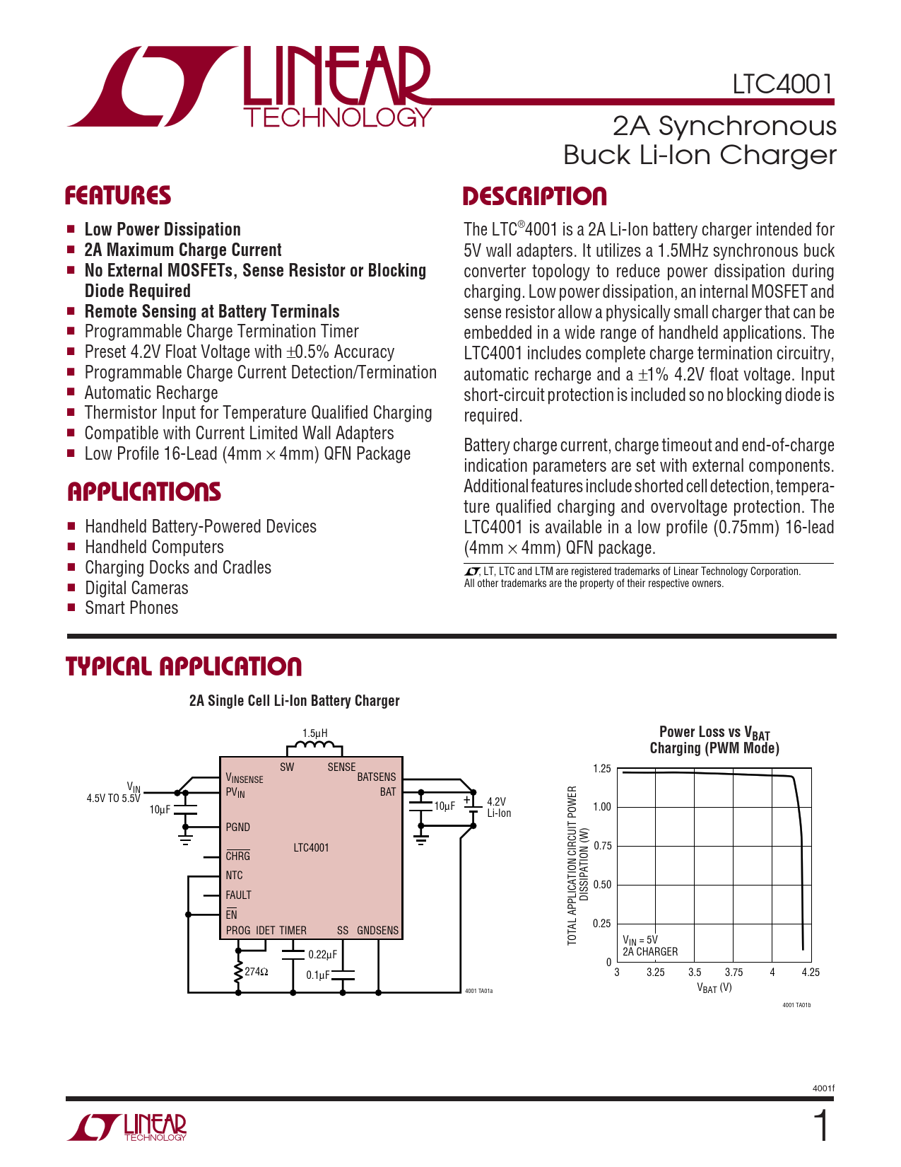 LTC4001 2A Synchronous Buck Li-Ion Charger UFEATURESDESCRIPTIO ■ Low Power Dissipation The LTC®4001 is a 2A Li-Ion battery charger intended for ■ 2A Maximum Charge Current 5V wall adapters. It utilizes a 1.5MHz synchronous buck ■ No External MOSFETs, Sense Resistor or Blocking converter topology to reduce power dissipation during Diode Required charging. Low power dissipation, an internal MOSFET and ■ Remote Sensing at Battery Terminals sense resistor allow a physically small charger that can be ■ Programmable Charge Termination Timer embedded in a wide range of handheld applications. The ■ Preset 4.2V Float Voltage with ±0.5% Accuracy LTC4001 includes complete charge termination circuitry, ■ Programmable Charge Current Detection/Termination automatic recharge and a ±1% 4.2V float voltage. Input ■ Automatic Recharge short-circuit protection is included so no blocking diode is ■ Thermistor Input for Temperature Qualified Charging required. ■ Compatible with Current Limited Wall Adapters Battery charge current, charge timeout and end-of-charge ■ Low Profile 16-Lead (4mm × 4mm) QFN Package U indication parameters are set with external components. APPLICATIO S Additional features include shorted cell detection, tempera- ture qualified charging and overvoltage protection. The ■ Handheld Battery-Powered Devices LTC4001 is available in a low profile (0.75mm) 16-lead ■ Handheld Computers (4mm × 4mm) QFN package. ■ Charging Docks and Cradles , LT, LTC and LTM are registered trademarks of Linear Technology Corporation. ■ Digital Cameras All other trademarks are the property of their respective owners. ■ Smart Phones UTYPICAL APPLICATIO2A Single Cell Li-Ion Battery Charger 1.5µH Power Loss vs VBATCharging (PWM Mode) SW SENSE 1.25 VINSENSE BATSENS VIN PVIN BAT 4.5V TO 5.5V + 10µF 4.2V 10µF 1.00 Li-Ion PGND LTC4001 0.75 CHRG NTC 0.50 FAULT DISSIPATION (W) EN 0.25 PROG IDET TIMER SS GNDSENS TOTAL APPLICATION CIRCUIT POWER VIN = 5V 0.22µF 2A CHARGER 0 274Ω 0.1µF 3 3.25 3.5 3.75 4 4.25 V 4001 TA01a BAT (V) 4001 TA01b 4001f 1