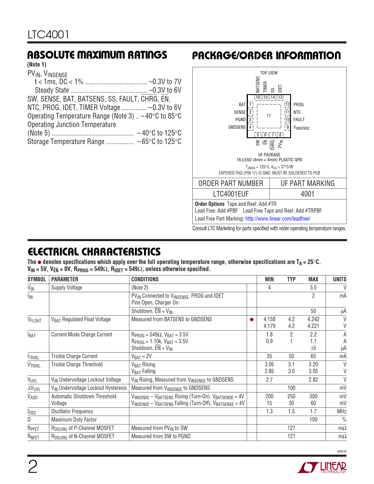 VIN Supply Voltage (Note 2) 4 5.5 V IIN PVIN Connected to VINSENSE, PROG and IDET 2 mA Pins Open, Charger On Shutdown, EN = VIN 50 µA VFLOAT VBAT Regulated Float Voltage Measured from BATSENS to GNDSENS ● 4.158 4.2 4.242 V 4.179 4.2 4.221 V IBAT Current Mode Charge Current RPROG = 549Ω, VBAT = 3.5V 1.8 2 2.2 A RPROG = 1.10k, VBAT = 3.5V 0.9 1 1.1 A Shutdown, EN = VIN ±5 µA ITRIKL Trickle Charge Current VBAT = 2V 35 50 65 mA VTRIKL Trickle Charge Threshold VBAT Rising 3.05 3.1 3.20 V VBAT Falling 2.85 3.0 3.05 V VUVL VIN Undervoltage Lockout Voltage VIN Rising, Measured from VINSENSE to GNDSENS 2.7 2.82 V ∆VUVL VIN Undervoltage Lockout Hysteresis Measured from VINSENSE to GNDSENS 100 mV VASD Automatic Shutdown Threshold VINSENSE – VBATSENS Rising (Turn-On), VBATSENSE = 4V 200 250 300 mV Voltage VINSENSE – VBATSENS Falling (Turn-Off), VBATSENSE = 4V 15 30 60 mV fOSC Oscillator Frequency 1.3 1.5 1.7 MHz D Maximum Duty Factor 100 % RPFET RDS(ON) of P-Channel MOSFET Measured from PVIN to SW 127 mΩ RNFET RDS(ON) of N-Channel MOSFET Measured from SW to PGND 121 mΩ 4001f 2