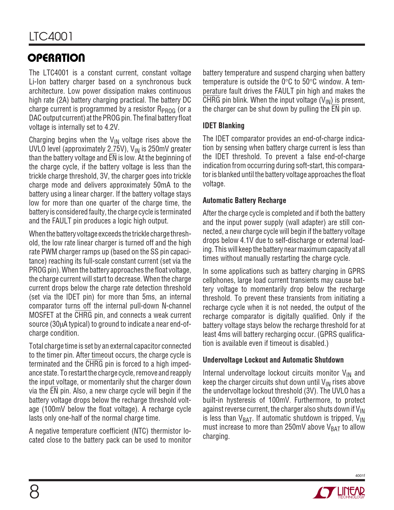 terminated and the CHRG pin is forced to a high imped- ance state. To restart the charge cycle, remove and reapply Internal undervoltage lockout circuits monitor VIN and the input voltage, or momentarily shut the charger down keep the charger circuits shut down until VIN rises above via the EN pin. Also, a new charge cycle will begin if the the undervoltage lockout threshold (3V). The UVLO has a battery voltage drops below the recharge threshold volt- built-in hysteresis of 100mV. Furthermore, to protect age (100mV below the float voltage). A recharge cycle against reverse current, the charger also shuts down if VIN lasts only one-half of the normal charge time. is less than VBAT. If automatic shutdown is tripped, VIN must increase to more than 250mV above V A negative temperature coefficient (NTC) thermistor lo- BAT to allow charging. cated close to the battery pack can be used to monitor 4001f 8