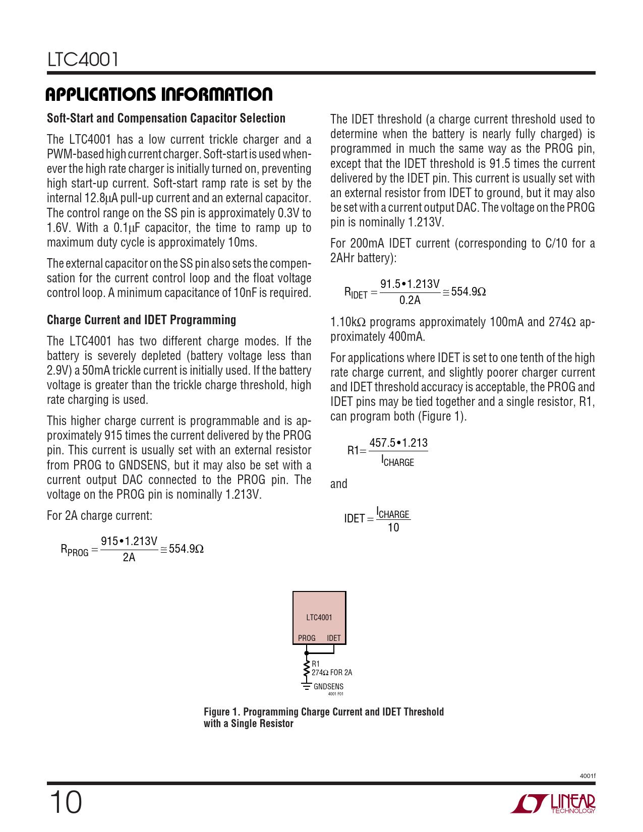 1.10kΩ programs approximately 100mA and 274Ω ap- The LTC4001 has two different charge modes. If the proximately 400mA. battery is severely depleted (battery voltage less than For applications where IDET is set to one tenth of the high 2.9V) a 50mA trickle current is initially used. If the battery rate charge current, and slightly poorer charger current voltage is greater than the trickle charge threshold, high and IDET threshold accuracy is acceptable, the PROG and rate charging is used. IDET pins may be tied together and a single resistor, R1, This higher charge current is programmable and is ap- can program both (Figure 1). proximately 915 times the current delivered by the PROG 457 5 1 213 pin. This current is usually set with an external resistor R1= . • . I from PROG to GNDSENS, but it may also be set with a CHARGE current output DAC connected to the PROG pin. The and voltage on the PROG pin is nominally 1.213V. For 2A charge current: I IDET CHARGE = 10 915 • 1 213 . V R = ≅ 554. Ω PROG 9 2A LTC4001 PROG IDET R1 274Ω FOR 2A GNDSENS 4001 F01