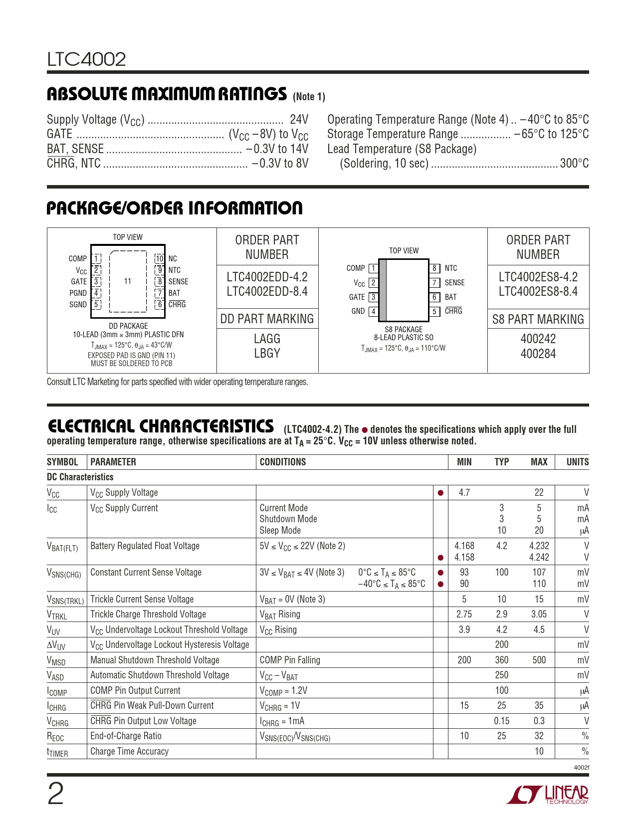 LTC4002 WWWUABSOLUTE AXI URATI GS (Note 1) Supply Voltage (VCC) .. 24V Operating Temperature Range (Note 4) .. – 40°C to 85°C GATE .. (VCC – 8V) to VCC Storage Temperature Range ... – 65°C to 125°C BAT, SENSE .. – 0.3V to 14V Lead Temperature (S8 Package) CHRG, NTC ... – 0.3V to 8V (Soldering, 10 sec) ... 300°C UWUPACKAGE/ORDER I FOR ATIO TOP VIEW ORDER PART ORDER PART NUMBER TOP VIEW NUMBER COMP 1 10 NC COMP 1 8 NTC V 2 9 NTC CC LTC4002EDD-4.2 LTC4002ES8-4.2 GATE 3 11 8 SENSE V 2 7 SENSE CC PGND 4 7 BAT LTC4002EDD-8.4 LTC4002ES8-8.4 GATE 3 6 BAT SGND 5 6 CHRG GND 4 5 CHRG DD PART MARKING S8 PART MARKING DD PACKAGE S8 PACKAGE 10-LEAD (3mm × 3mm) PLASTIC DFN 8-LEAD PLASTIC SO LAGG 400242 TJMAX = 125°C, θJA = 43°C/W TJMAX = 125°C, θJA = 110°C/W EXPOSED PAD IS GND (PIN 11) LBGY 400284 MUST BE SOLDERED TO PCB Consult LTC Marketing for parts specified with wider operating temperature ranges. ELECTRICAL CHARACTERISTICS (LTC4002-4.2) The ● denotes the specifications which apply over the fulloperating temperature range, otherwise specifications are at TA = 25 ° C. VCC = 10V unless otherwise noted.SYMBOLPARAMETERCONDITIONSMINTYPMAXUNITSDC Characteristics VCC VCC Supply Voltage ● 4.7 22 V ICC VCC Supply Current Current Mode 3 5 mA Shutdown Mode 3 5 mA Sleep Mode 10 20 µA VBAT(FLT) Battery Regulated Float Voltage 5V ≤ VCC ≤ 22V (Note 2) 4.168 4.2 4.232 V ● 4.158 4.242 V VSNS(CHG) Constant Current Sense Voltage 3V ≤ VBAT ≤ 4V (Note 3) 0°C ≤ TA ≤ 85°C ● 93 100 107 mV –40°C ≤ TA ≤ 85°C ● 90 110 mV VSNS(TRKL) Trickle Current Sense Voltage VBAT = 0V (Note 3) 5 10 15 mV VTRKL Trickle Charge Threshold Voltage VBAT Rising 2.75 2.9 3.05 V VUV VCC Undervoltage Lockout Threshold Voltage VCC Rising 3.9 4.2 4.5 V ∆VUV VCC Undervoltage Lockout Hysteresis Voltage 200 mV VMSD Manual Shutdown Threshold Voltage COMP Pin Falling 200 360 500 mV VASD Automatic Shutdown Threshold Voltage VCC – VBAT 250 mV ICOMP COMP Pin Output Current VCOMP = 1.2V 100 µA ICHRG CHRG Pin Weak Pull-Down Current VCHRG = 1V 15 25 35 µA VCHRG CHRG Pin Output Low Voltage ICHRG = 1mA 0.15 0.3 V REOC End-of-Charge Ratio VSNS(EOC)/VSNS(CHG) 10 25 32 % tTIMER Charge Time Accuracy 10 % 4002f 2